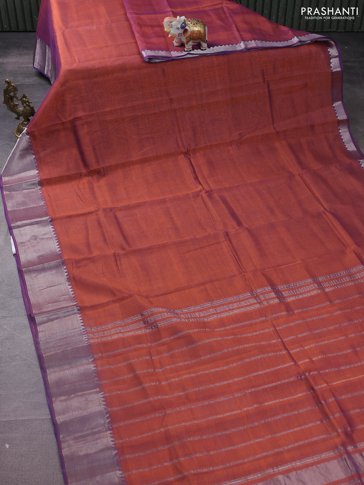 Mangalgiri silk cotton saree dual shade of rust and cs blue with plain body and silver zari woven border