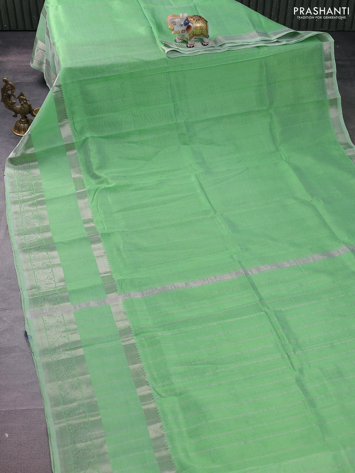 Mangalgiri silk cotton saree green and purple with plain body and long rettapet silver zari woven border