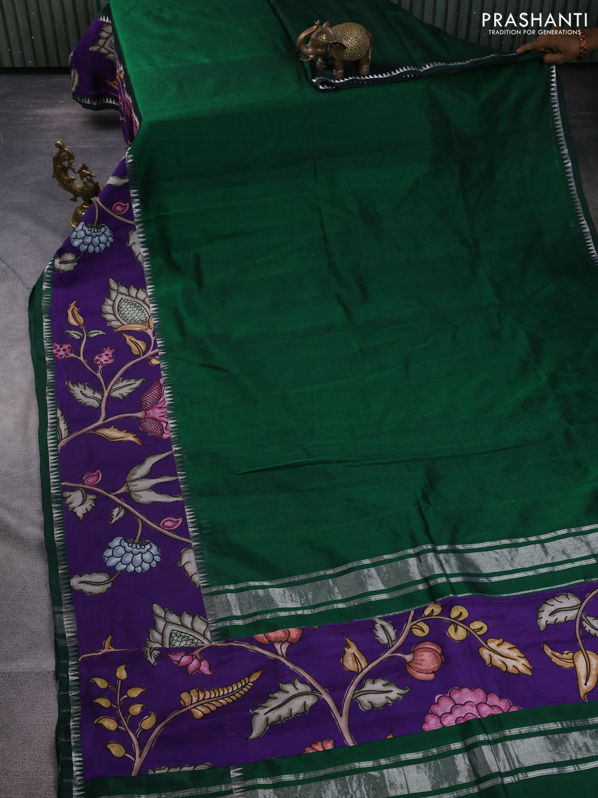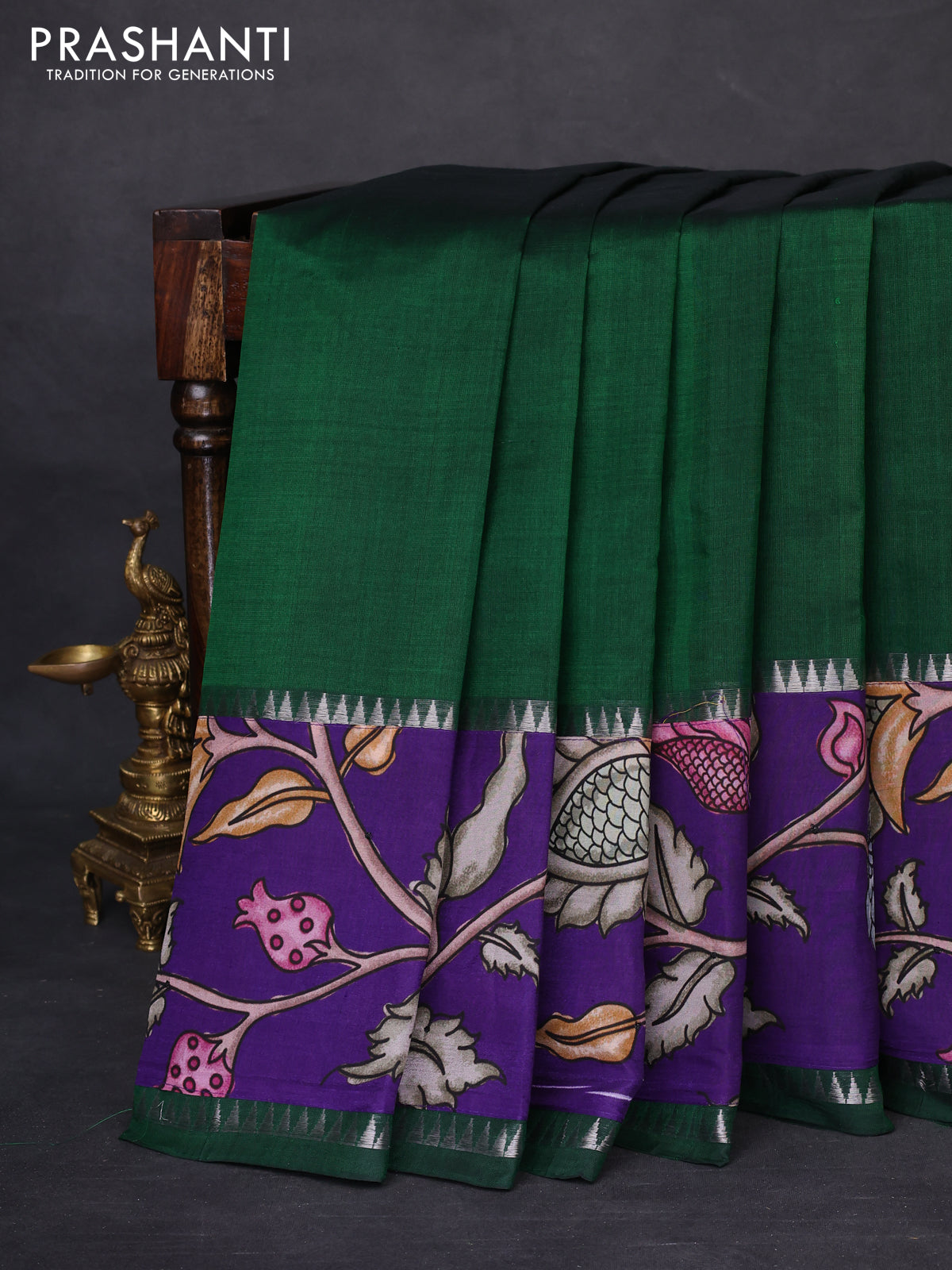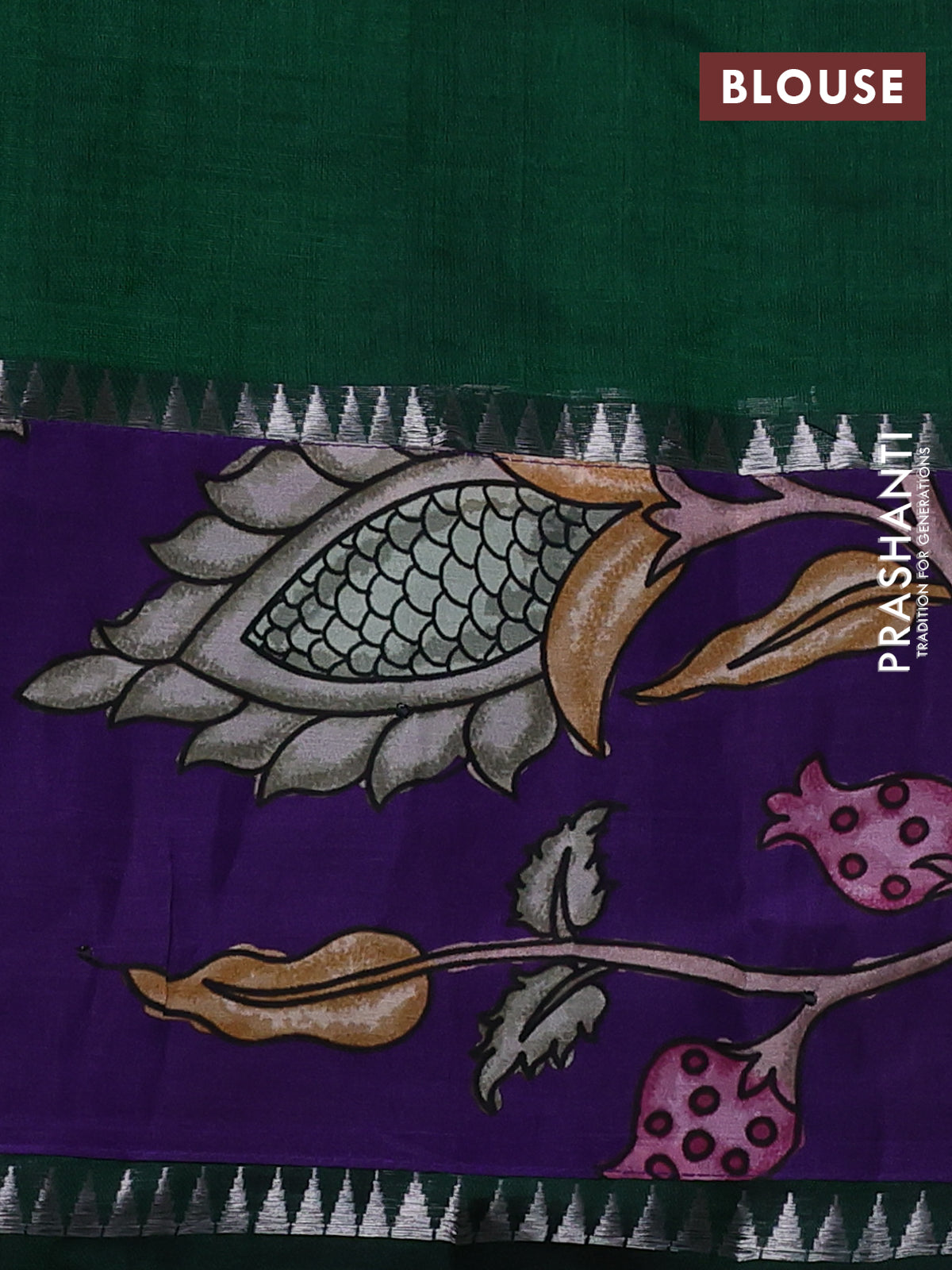 Mangalgiri silk cotton saree green and violet with plain body and temple design kalamkari printed applique border