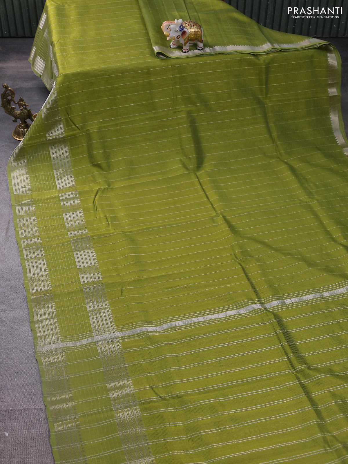 Mangalgiri silk cotton saree light green and pink shade with allover silver zari stripe pattern and long rettapet silver zari wove checked border