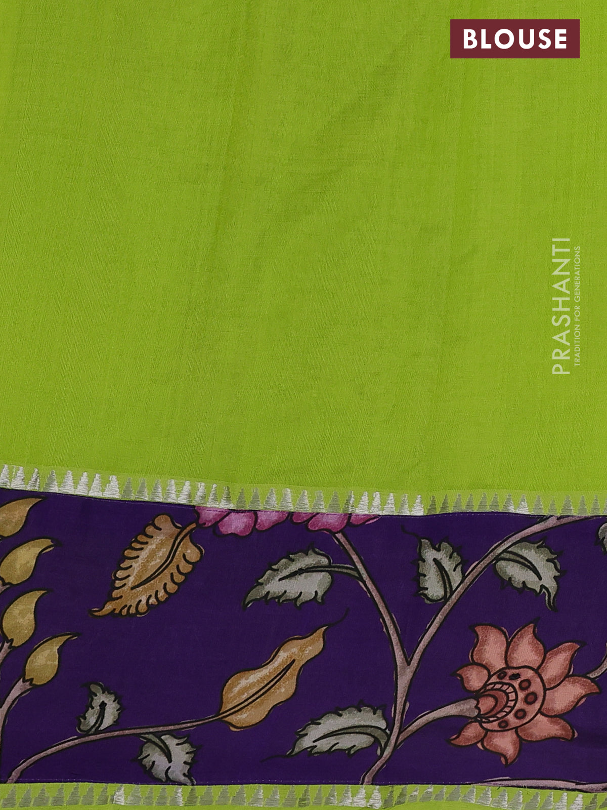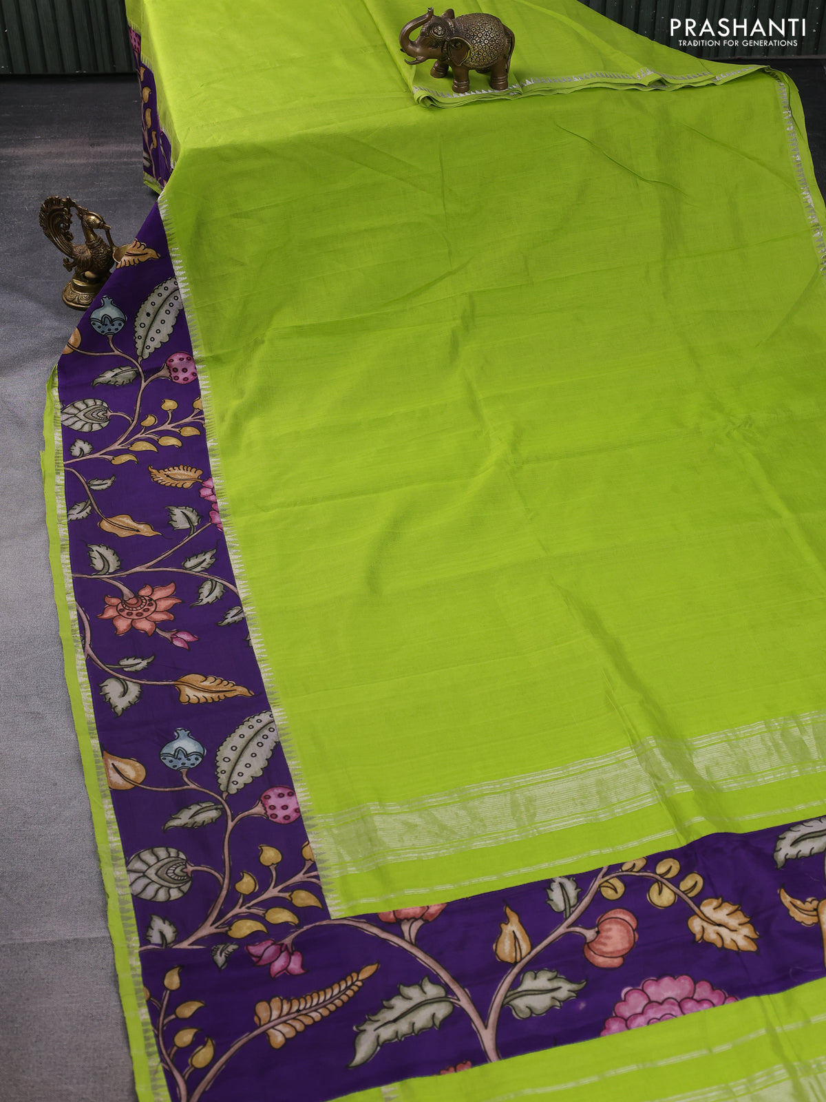 Mangalgiri silk cotton saree light green and violet with plain body and long kalamkari printed applique border