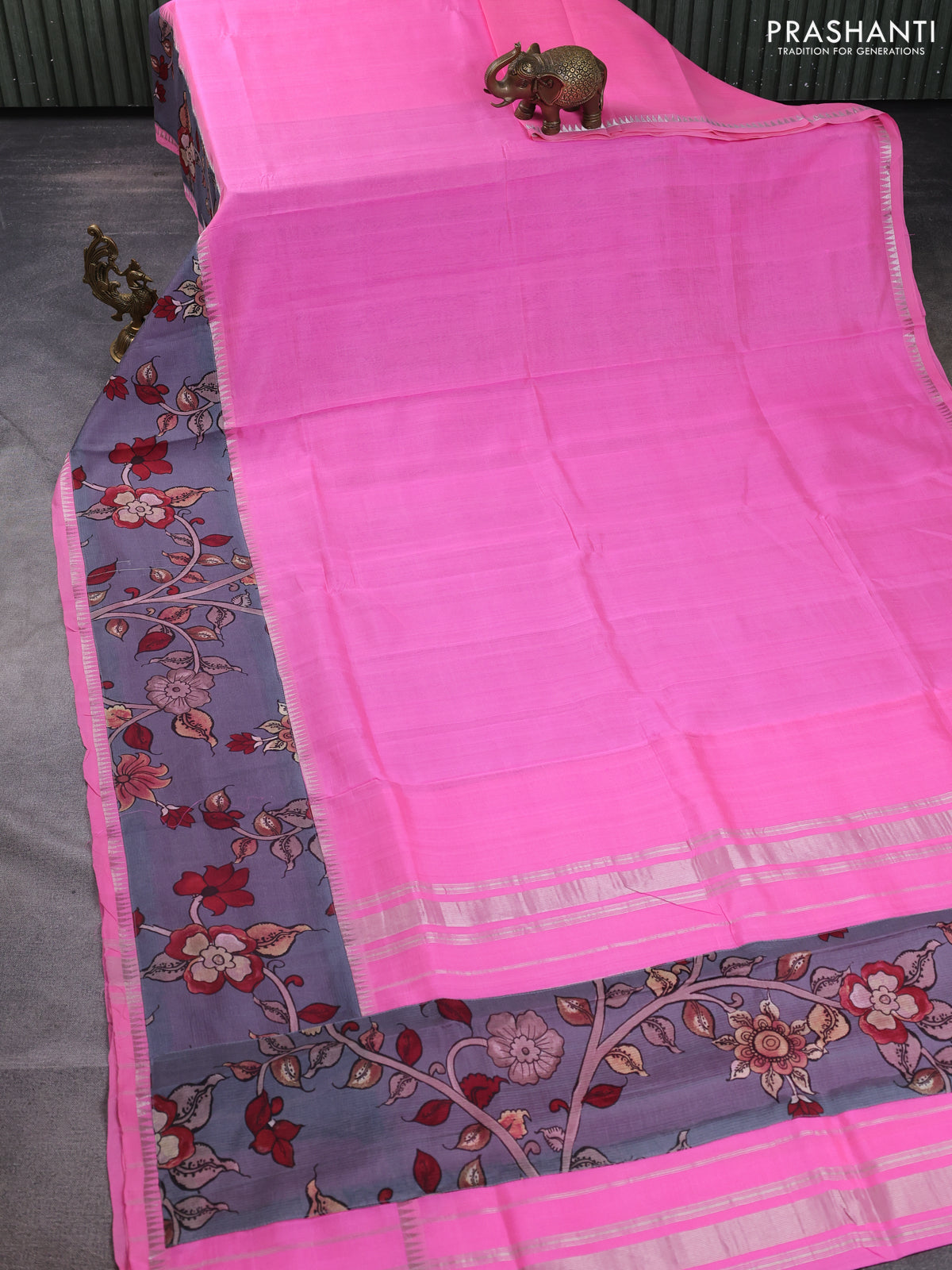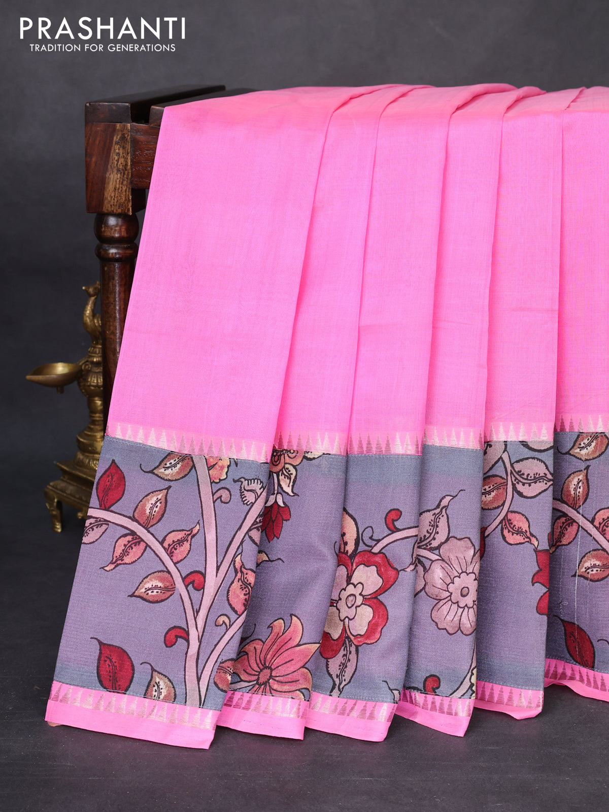 Mangalgiri silk cotton saree light pink and grey with plain body and temple design kalamkari printed applique border
