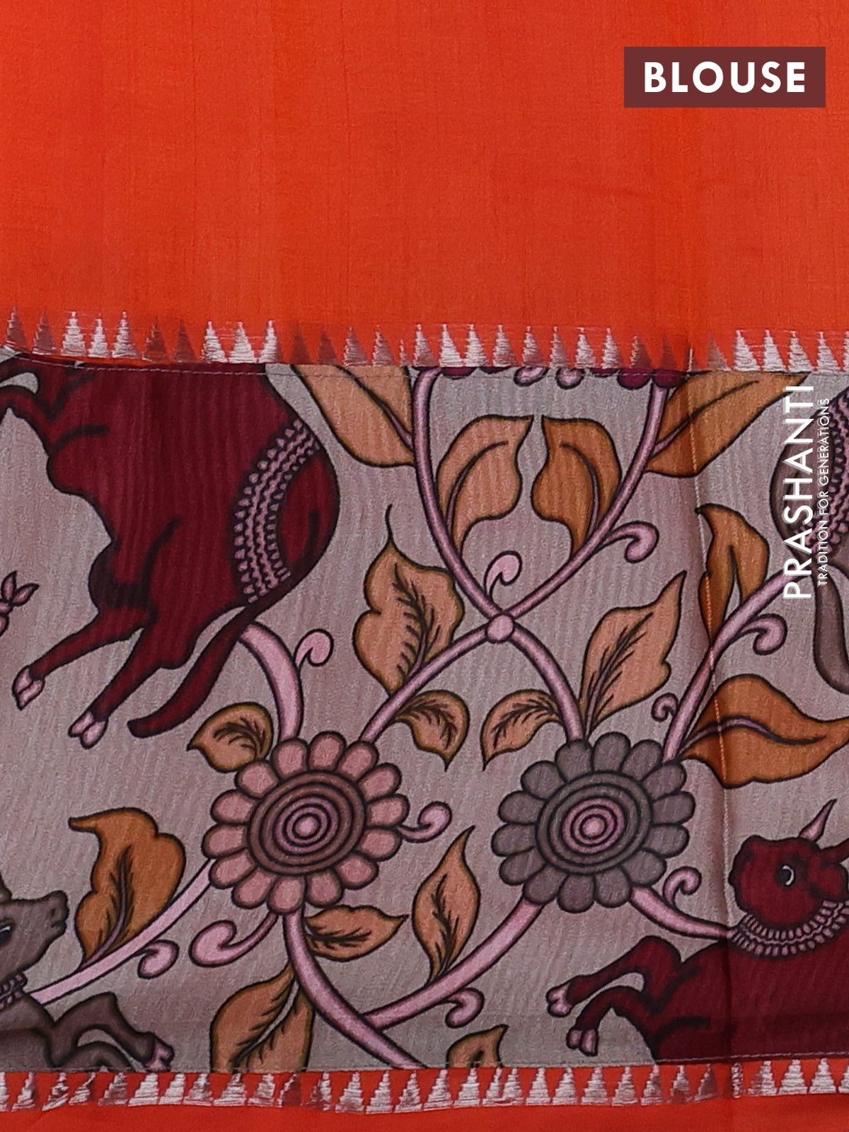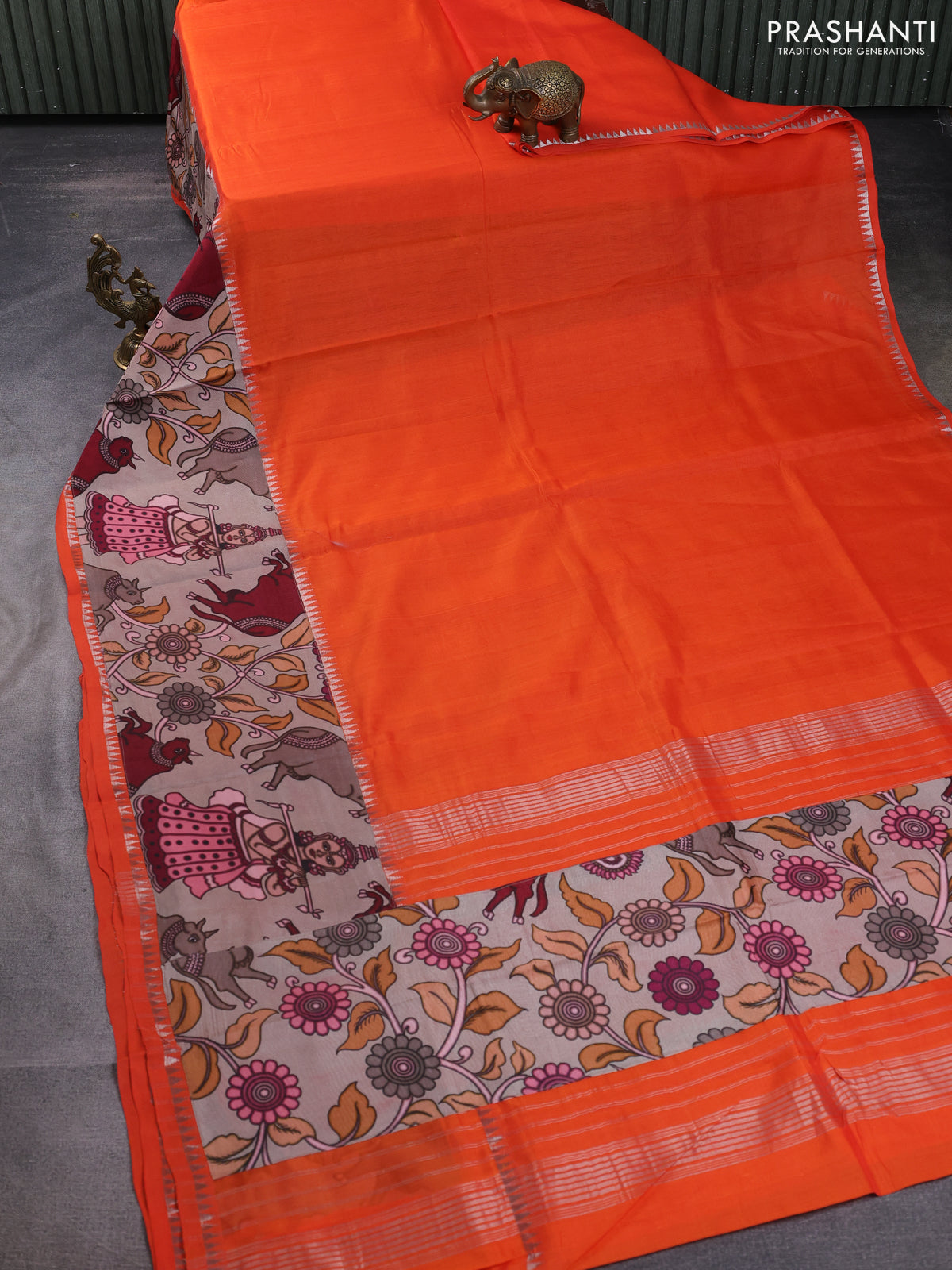 Mangalgiri silk cotton saree orange and beige with plain body and temple design kalamkari printed applique border