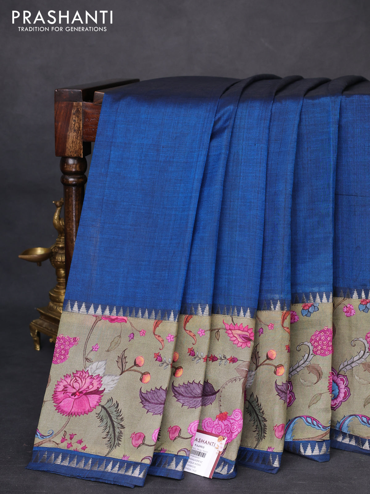 Mangalgiri silk cotton saree peacock blue and pastel green with plain body and temple design kalamkari printed applique border