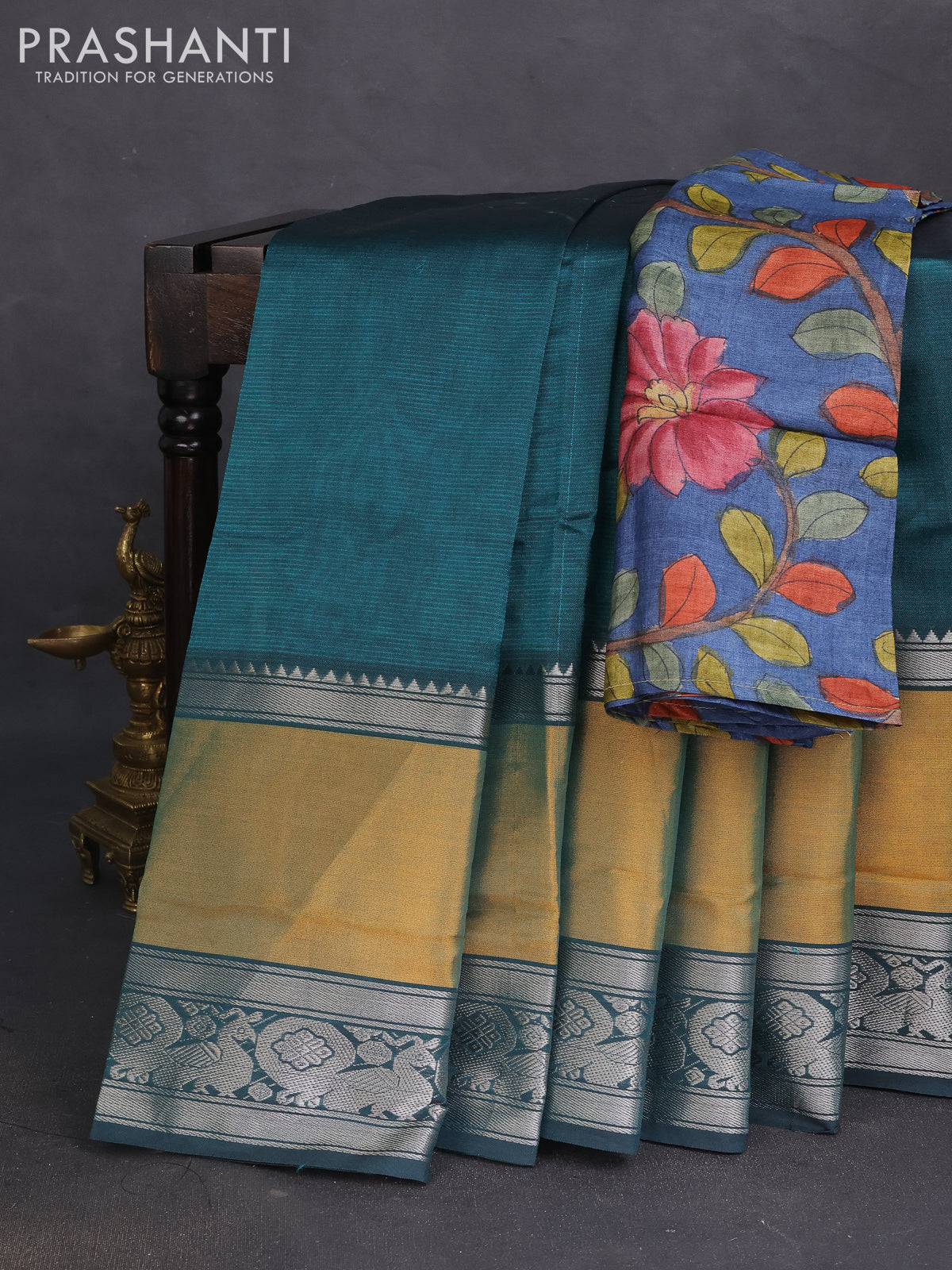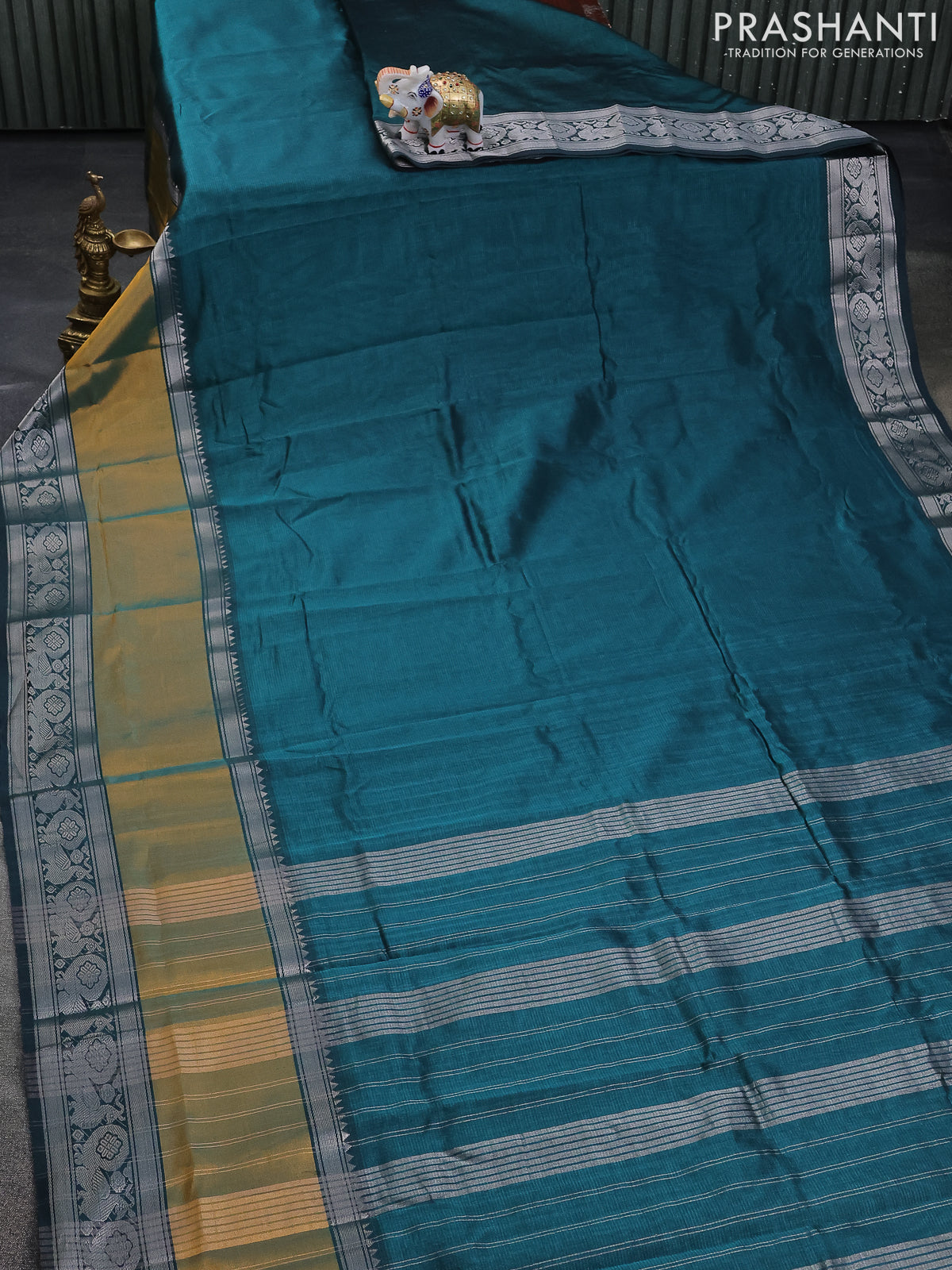 Mangalgiri silk cotton saree peacock green and blue with plain body and long rettapet silver zari woven border