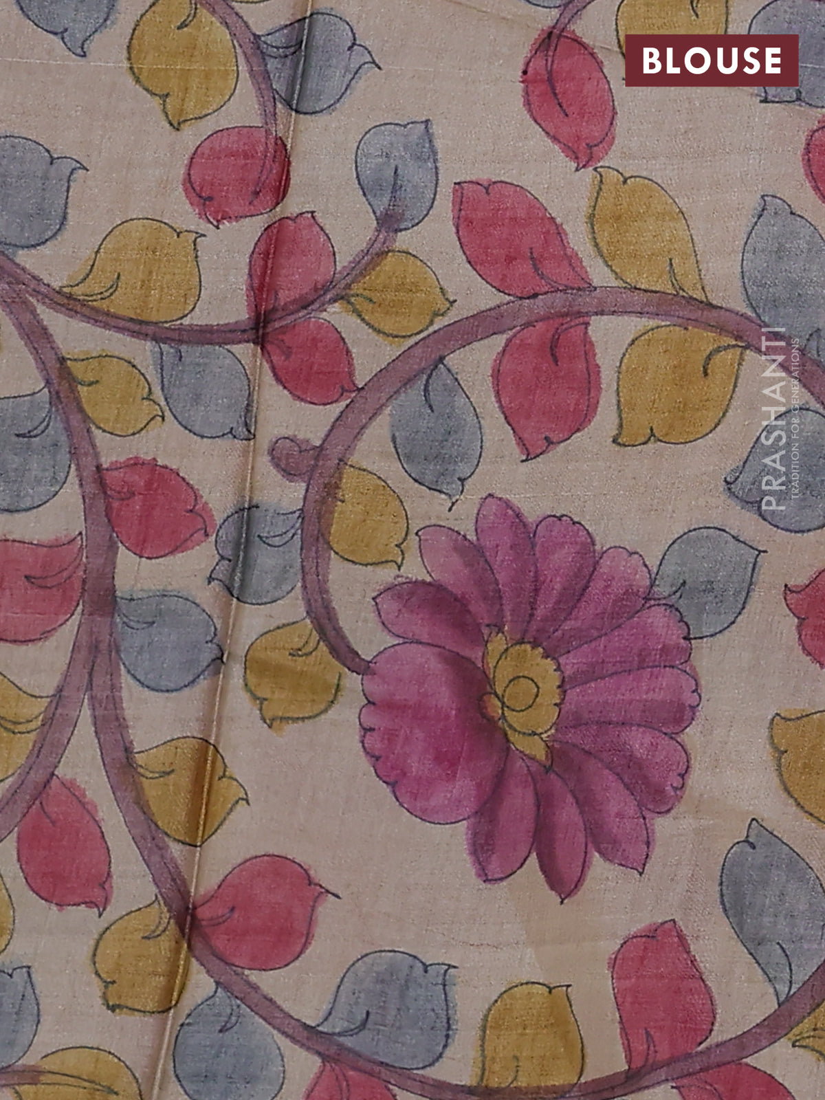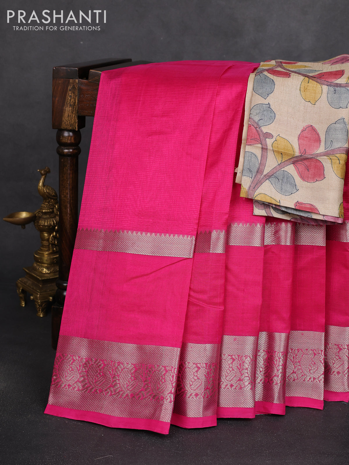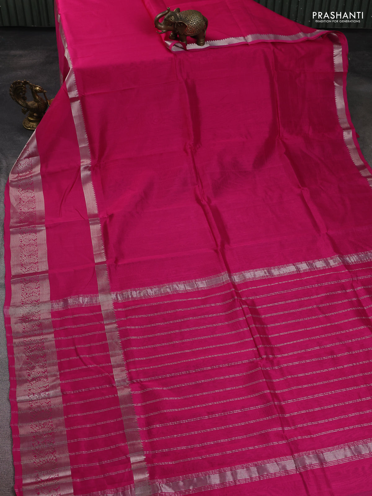 Mangalgiri silk cotton saree pink and beige with plain body and long rettapet silver zari woven border