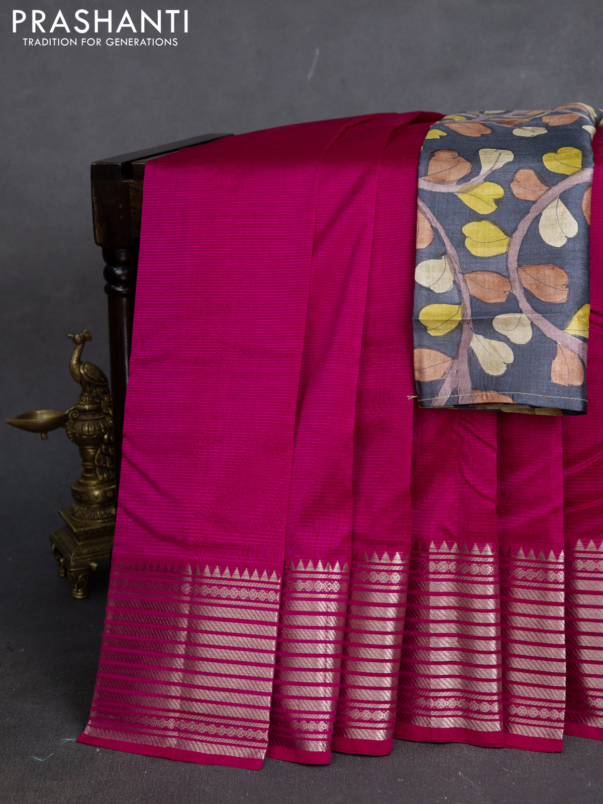 Mangalgiri silk cotton saree pink and elephant grey with plain body and silver zari woven border