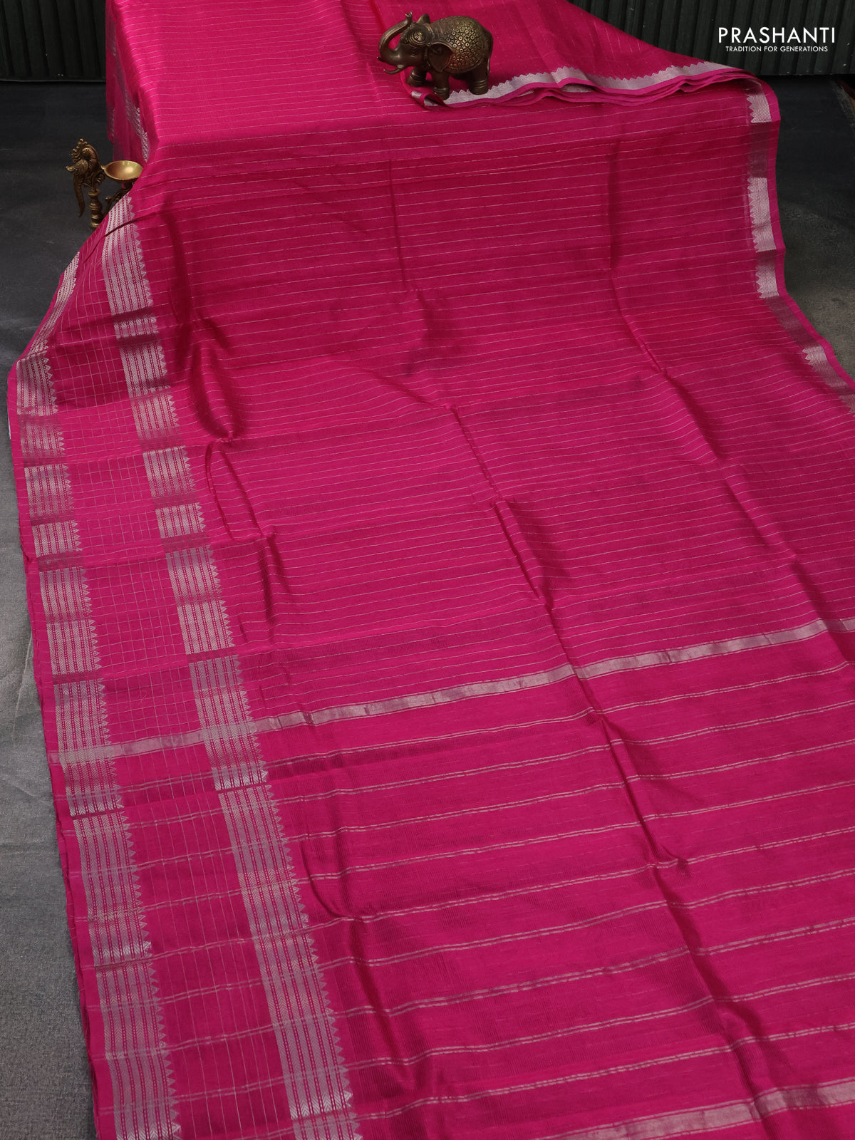 Mangalgiri silk cotton saree pink and mustard yellow with allover silver zari stripe pattern and long rettapet silver zari wove checked border
