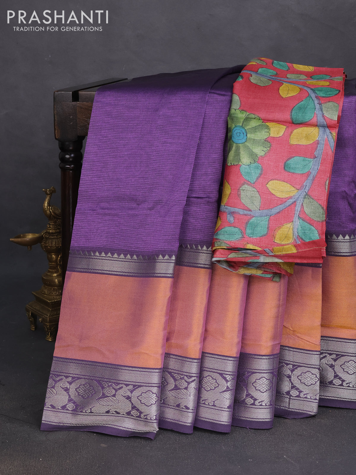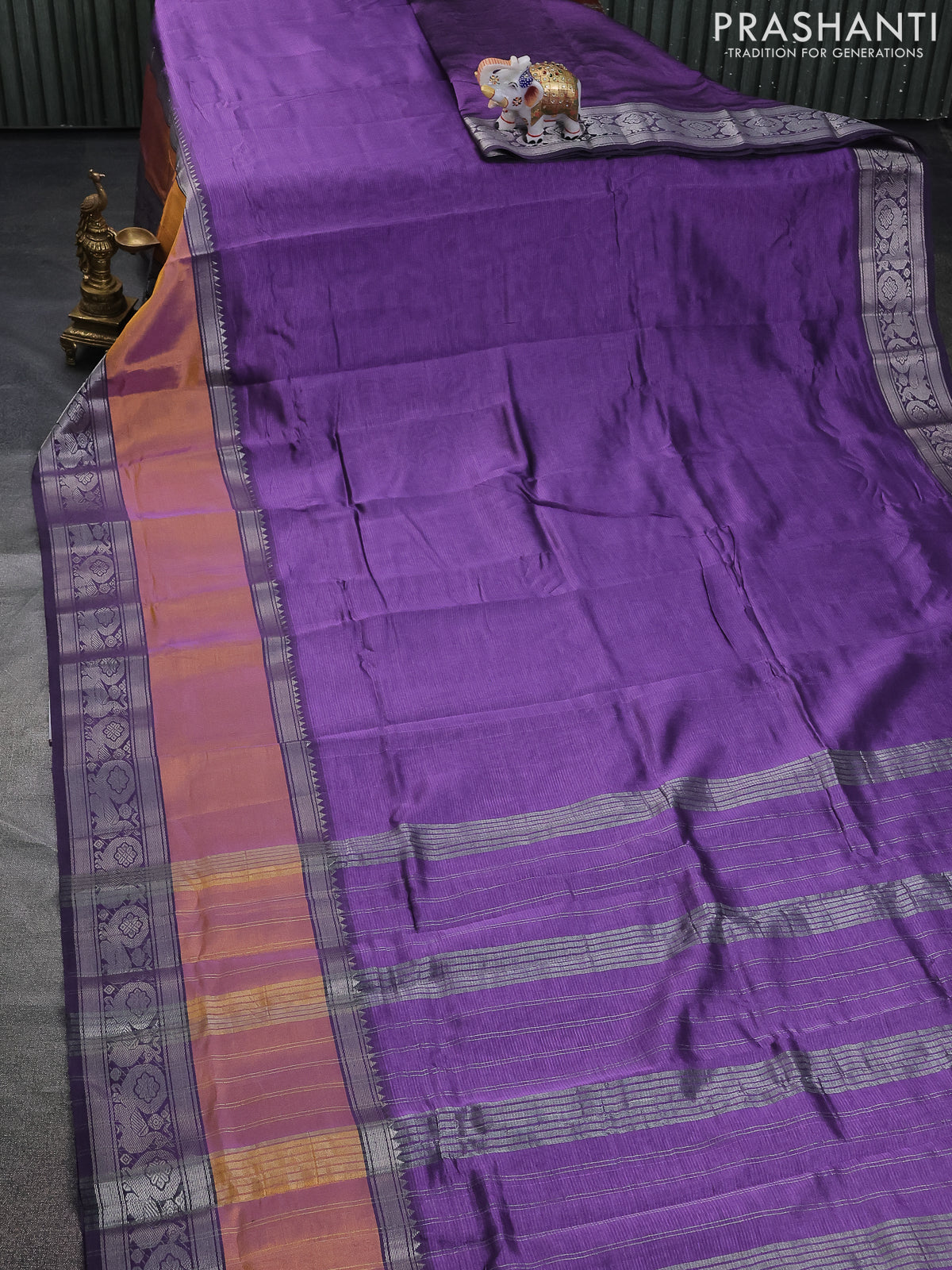 Mangalgiri silk cotton saree purple shade and maroon with plain body and long rettapet silver zari woven border