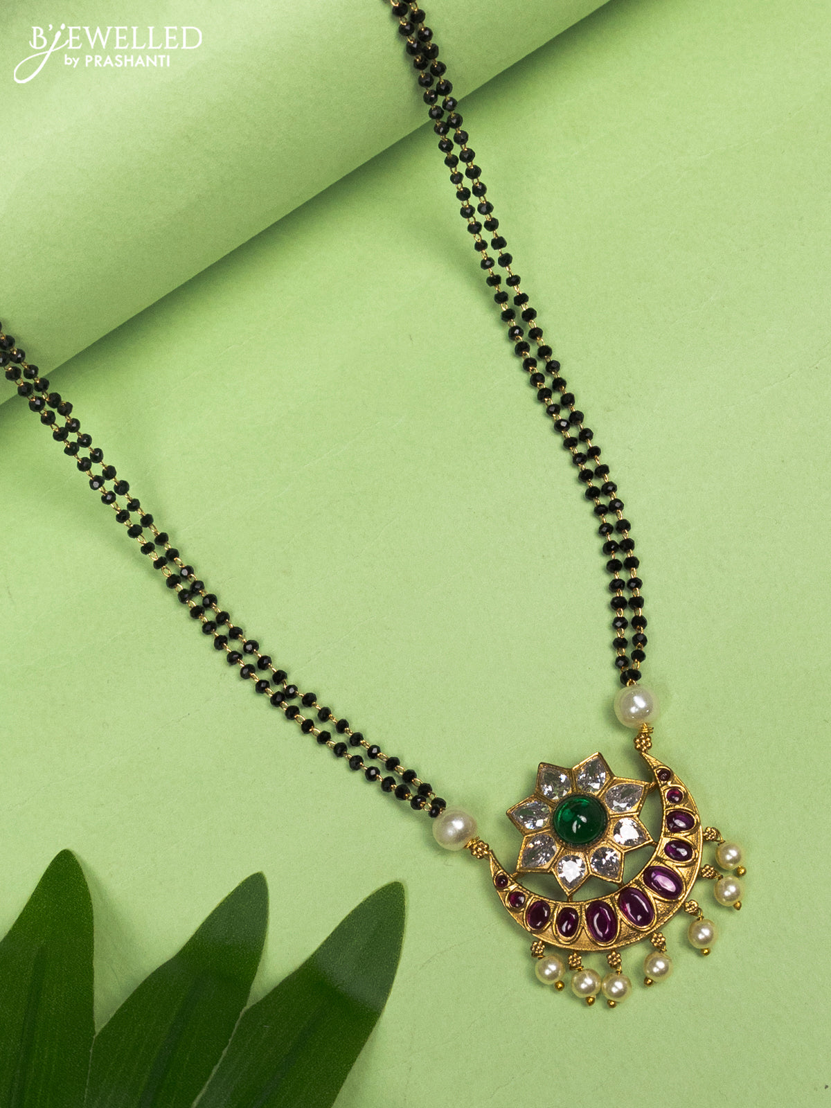 Mangalsutra double layer chandbali pendant with kemp & cz stones and pearl hangings without earring