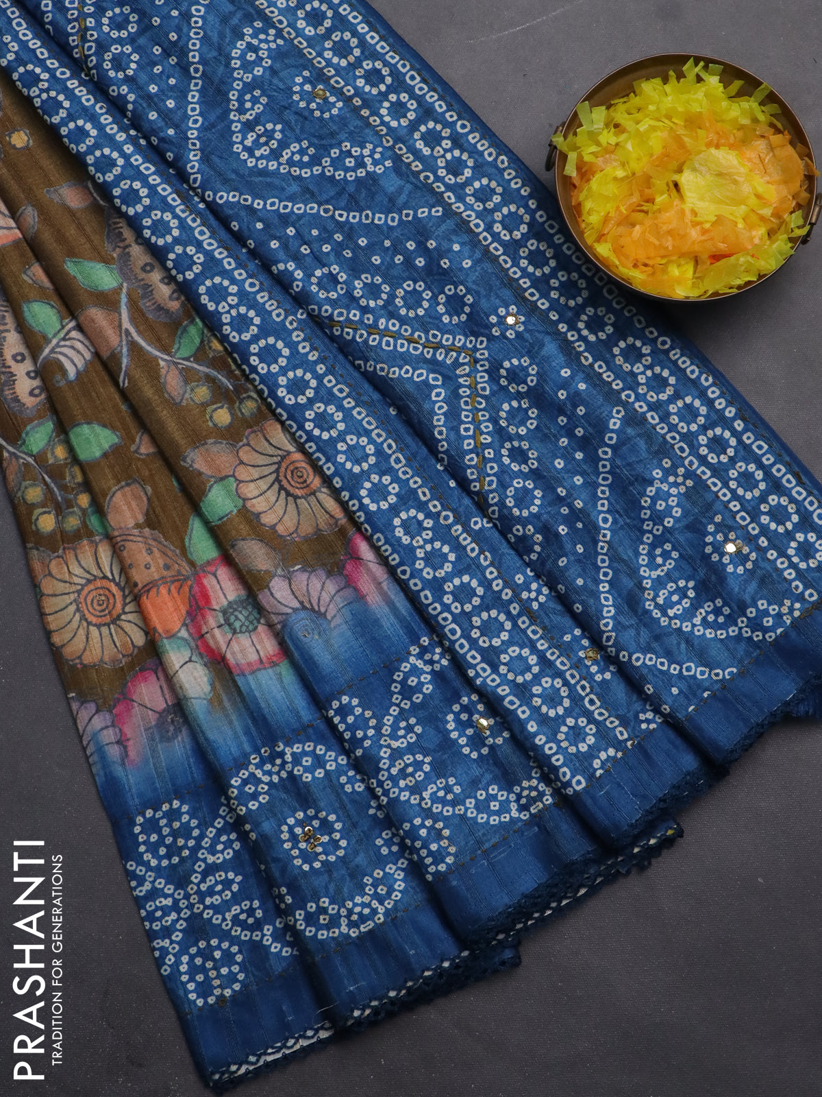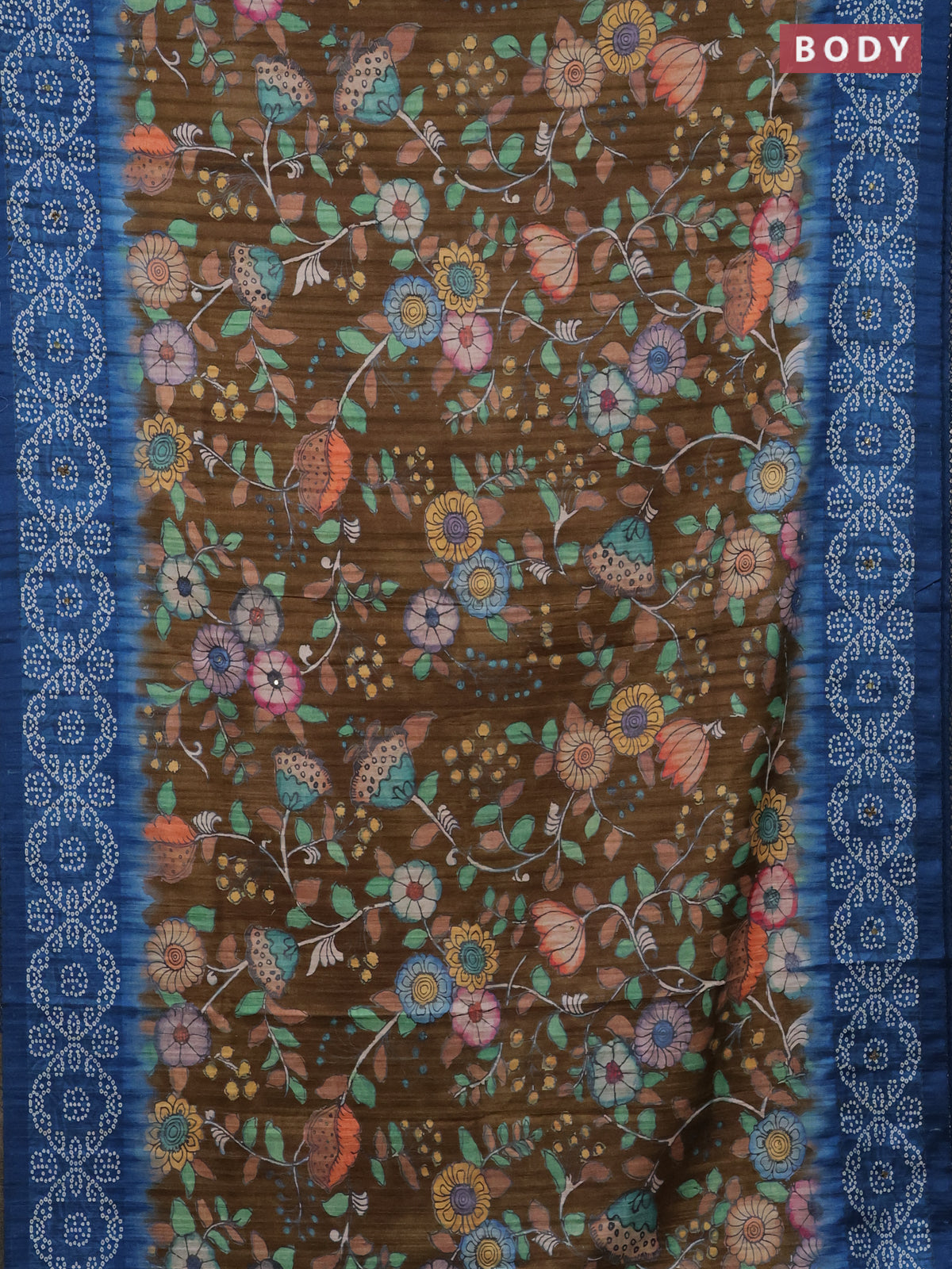 Matka tussar saree dark mehendi green and blue with allover kalamkari prints and bandhani printed & embroidery work border 1damage