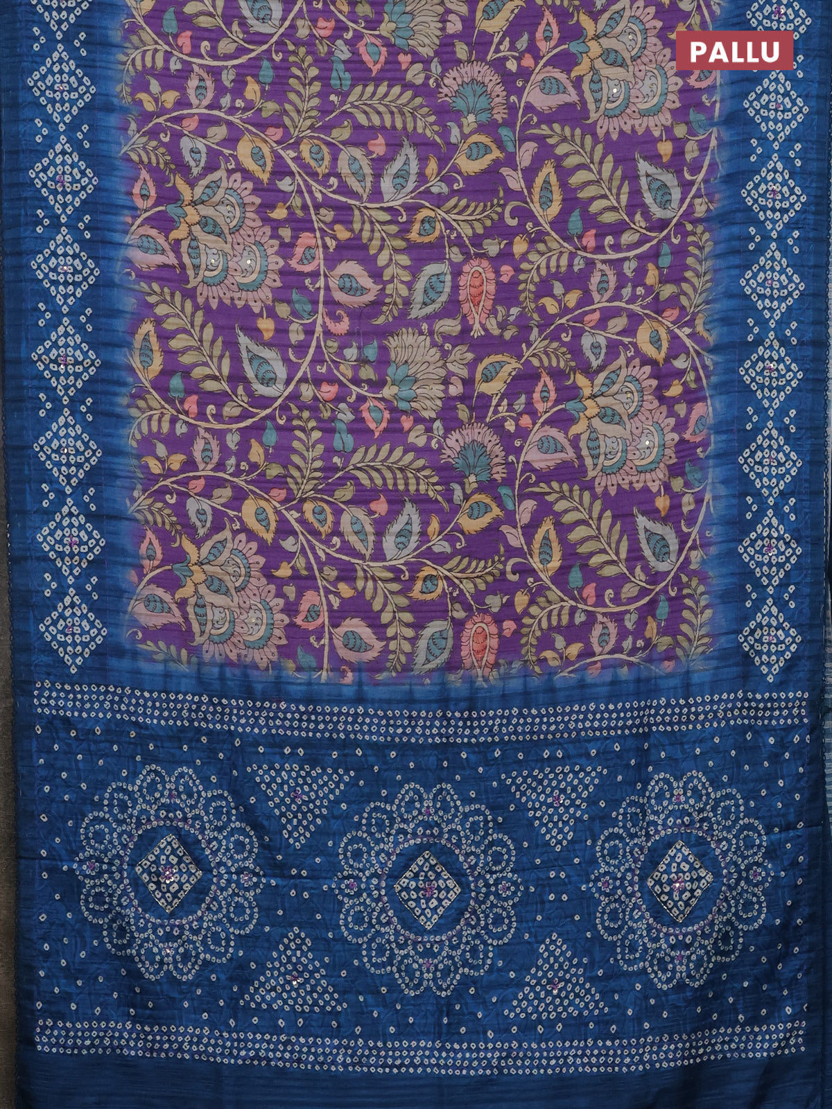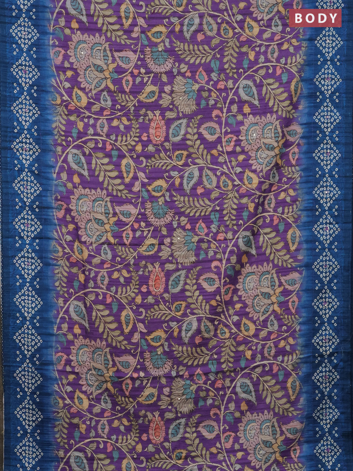 Matka tussar saree lavender and peacock blue with allover kalamkari prints and bandhani printed & embroidery work border