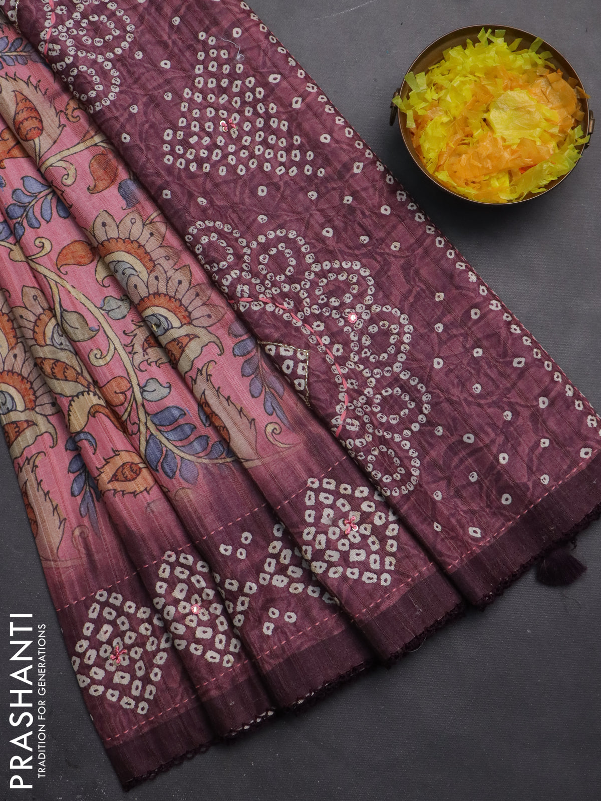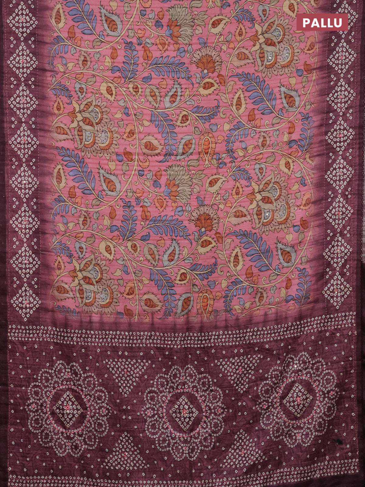 Matka tussar saree peach pink and deep jamun shade with allover kalamkari prints and bandhani printed & embroidery work border