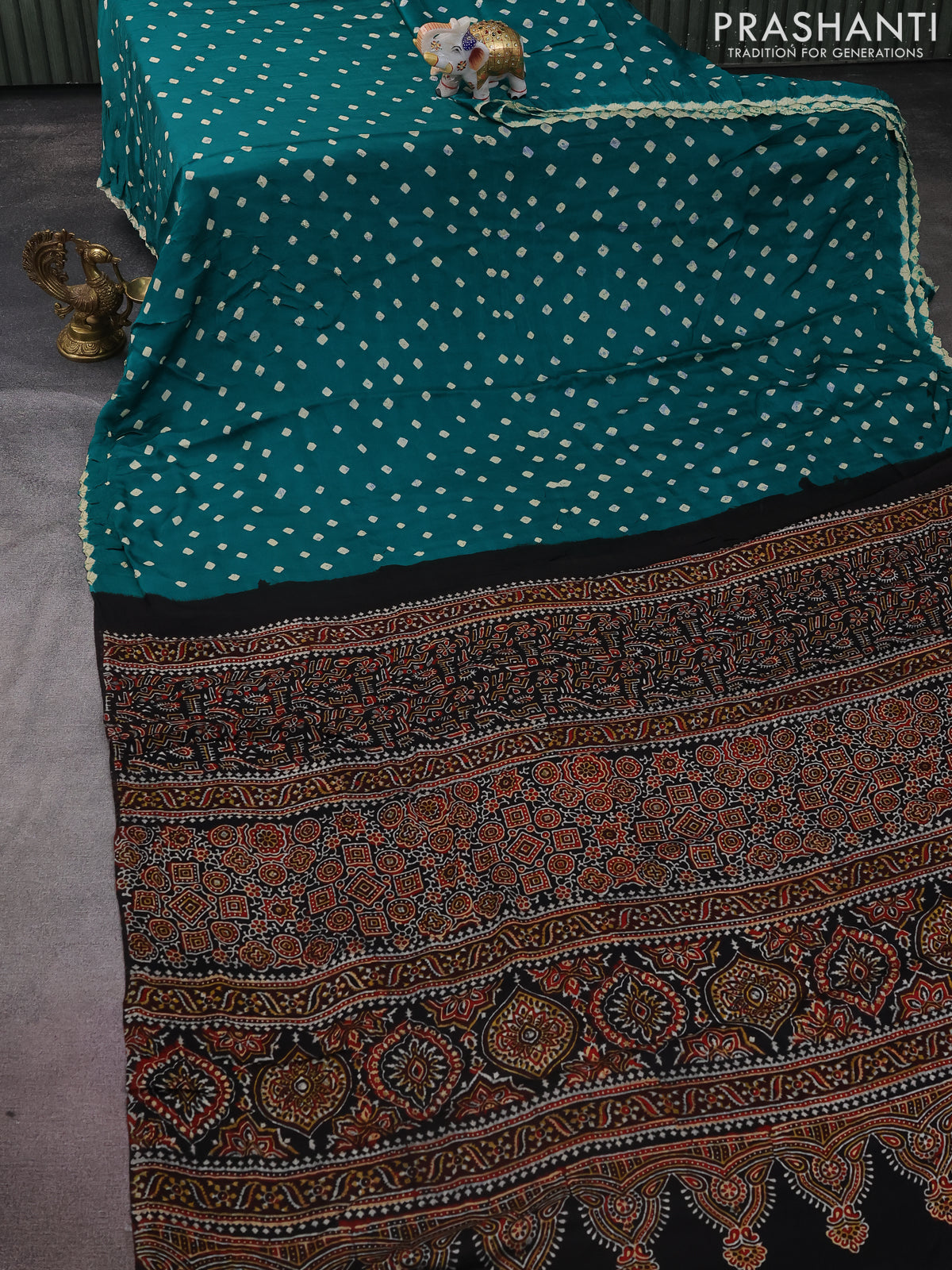 Modal silk saree green and black with allover bandhini prints and ajrakh printed pallu & blouse