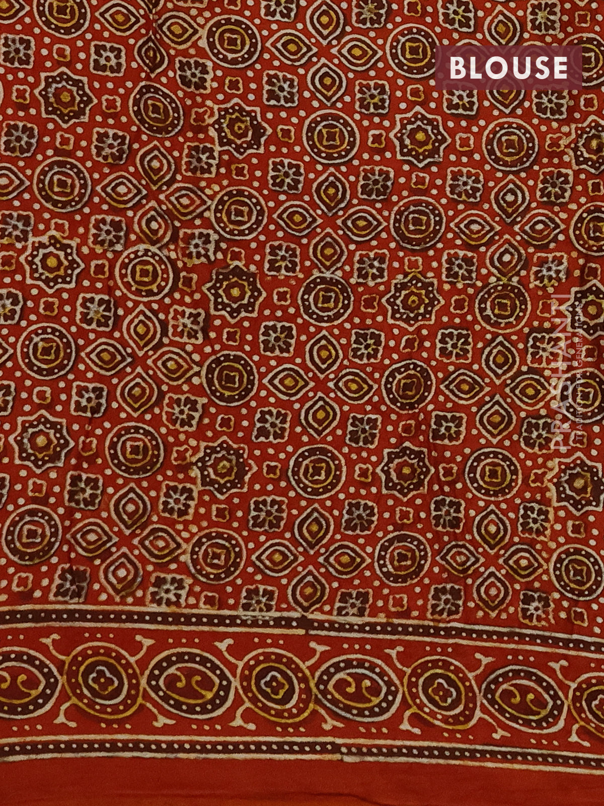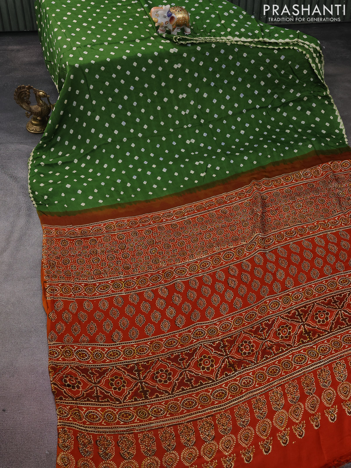 Modal silk saree mehendi green and orange with allover bandhini prints and ajrakh printed pallu & blouse