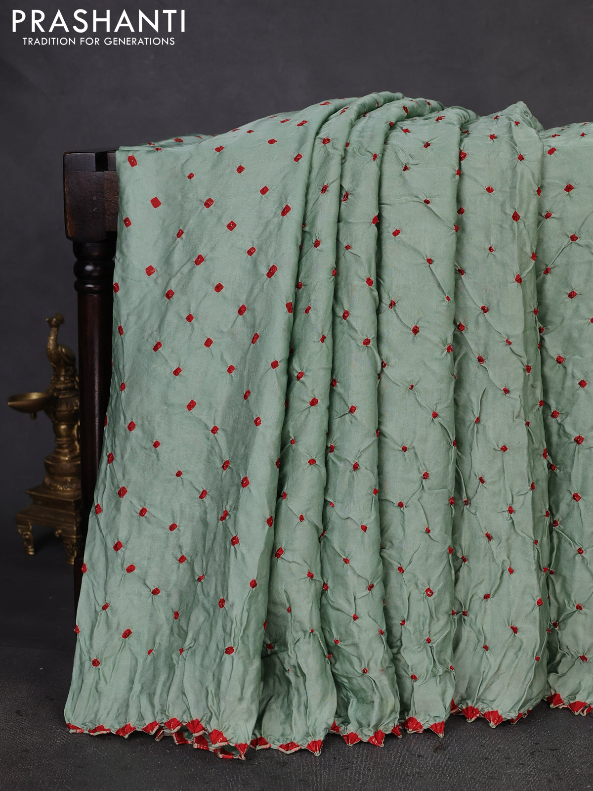 Modal silk saree pastel green and maroon with allover bandhani butta prints and ajrakh printed pallu & Blouse