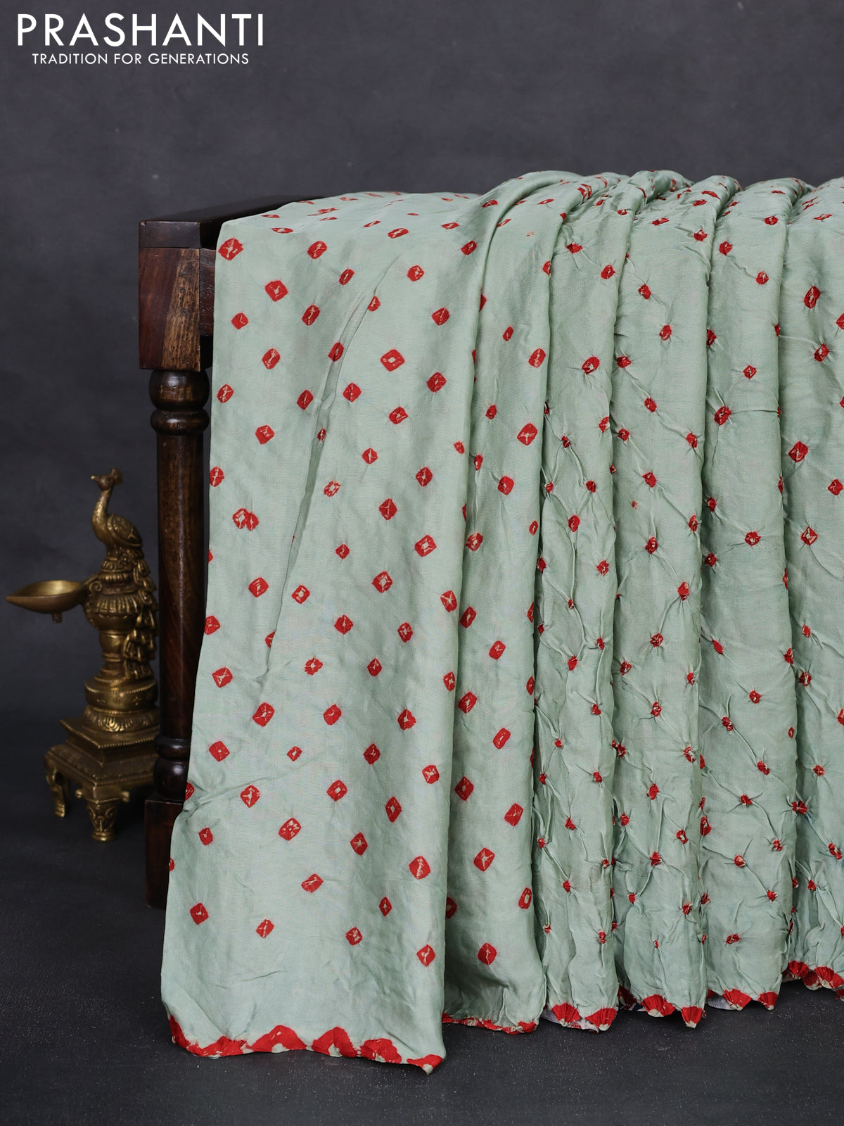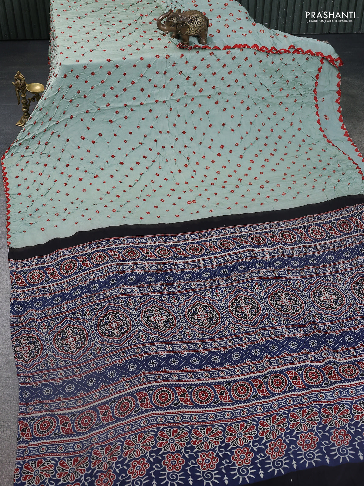 Modal silk saree pastel green and peacock blue with allover bandhani butta prints and ajrakh printed pallu & Blouse
