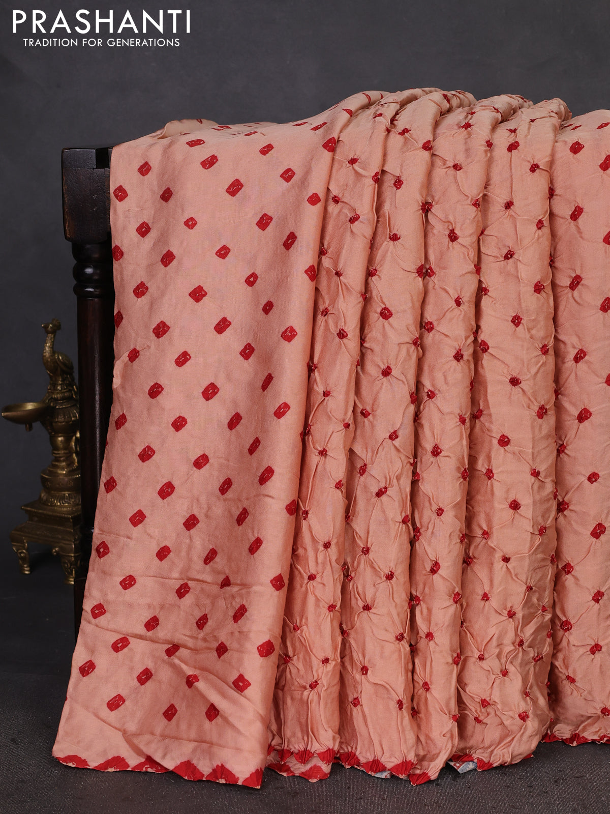 Modal silk saree peach orange and blue with allover bandhani butta prints and ajrakh printed pallu & Blouse