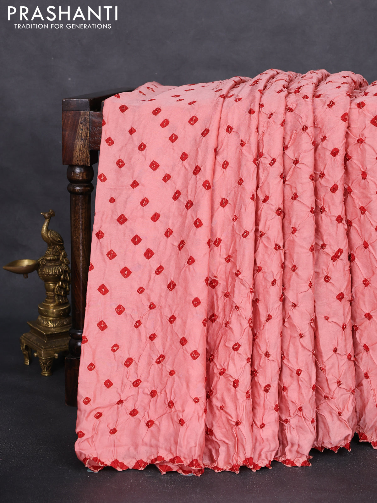 Modal silk saree peach orange and maroon with allover bandhani butta prints and ajrakh printed pallu & Blouse