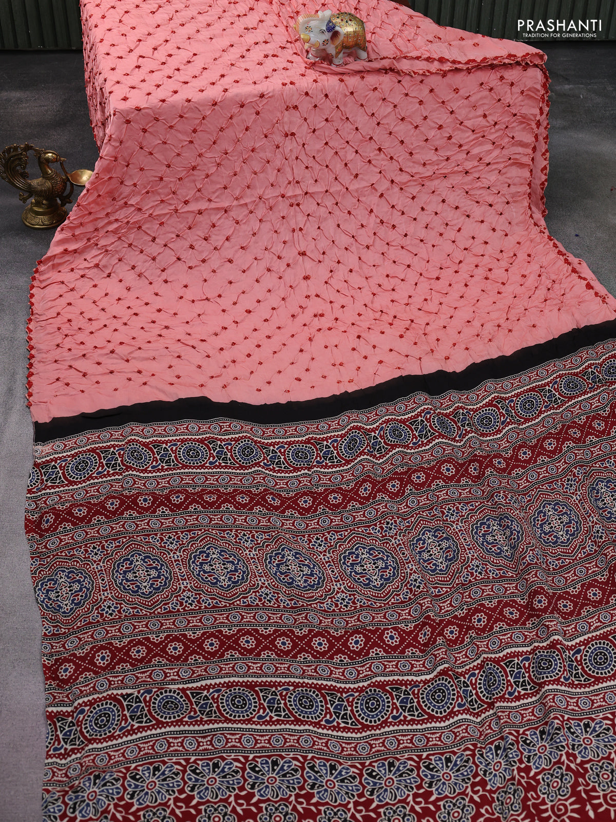 Modal silk saree peach shade and maroon with allover bandhani butta prints and ajrakh printed pallu & Blouse