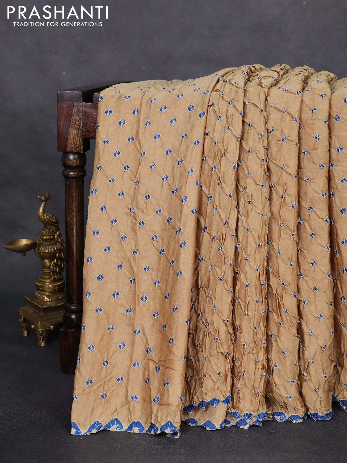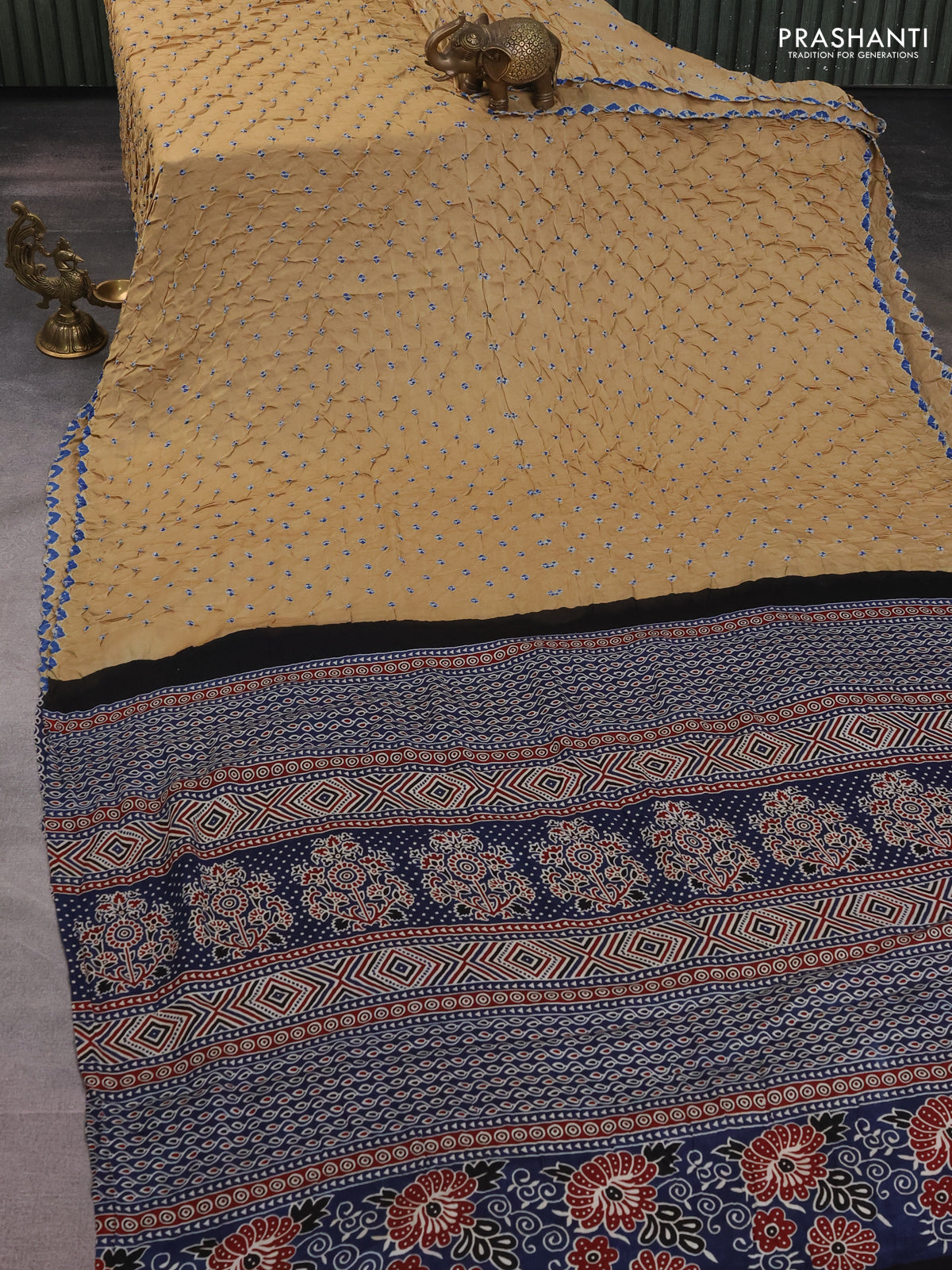 Modal silk saree sandal and peacock blue with allover bandhani butta prints and ajrakh printed pallu & Blouse