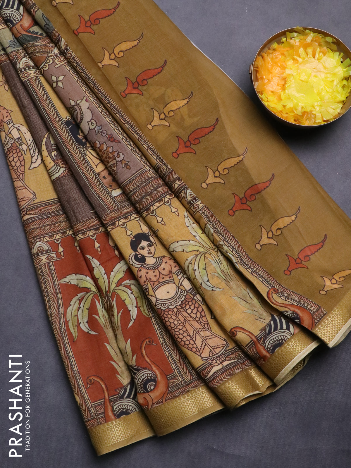 Mul cotton saree multi colour and mehendi green with kalamkari prints and zari woven border