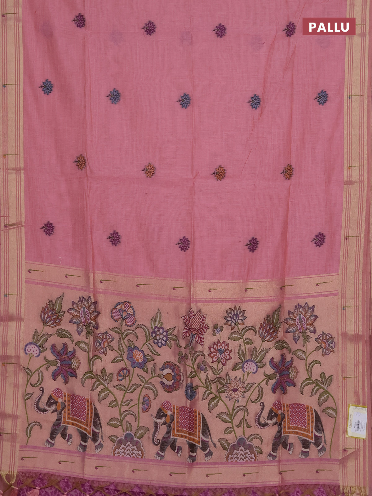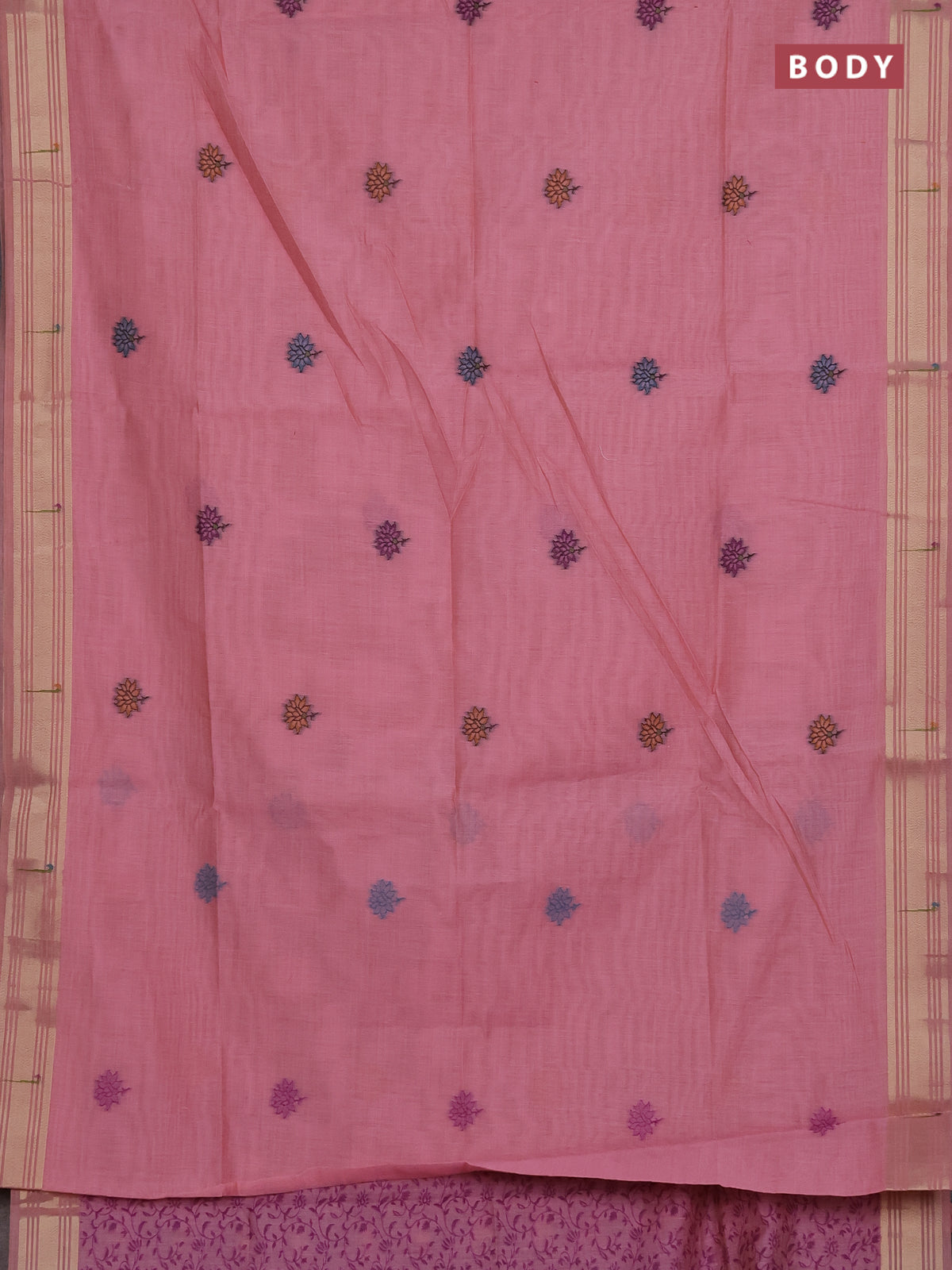 Munga cotton saree peach pink with thread woven floral buttas and floral design weaving pallu