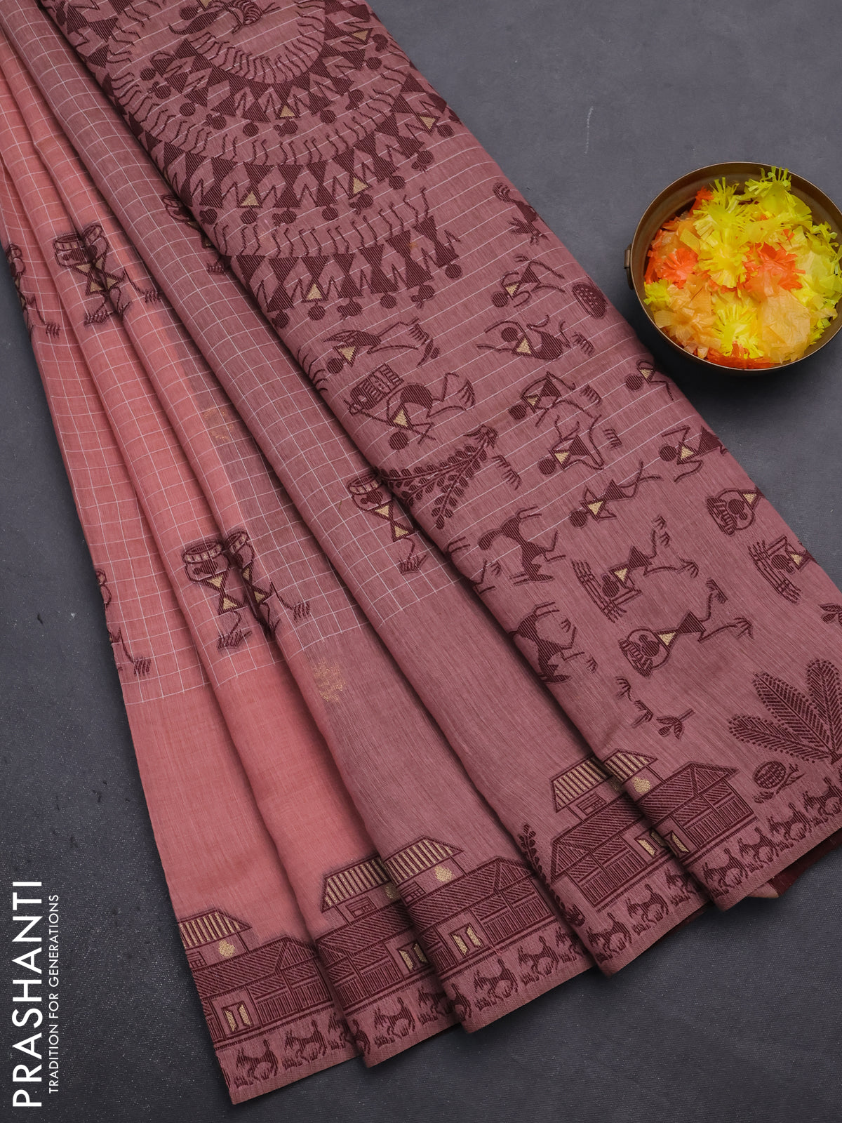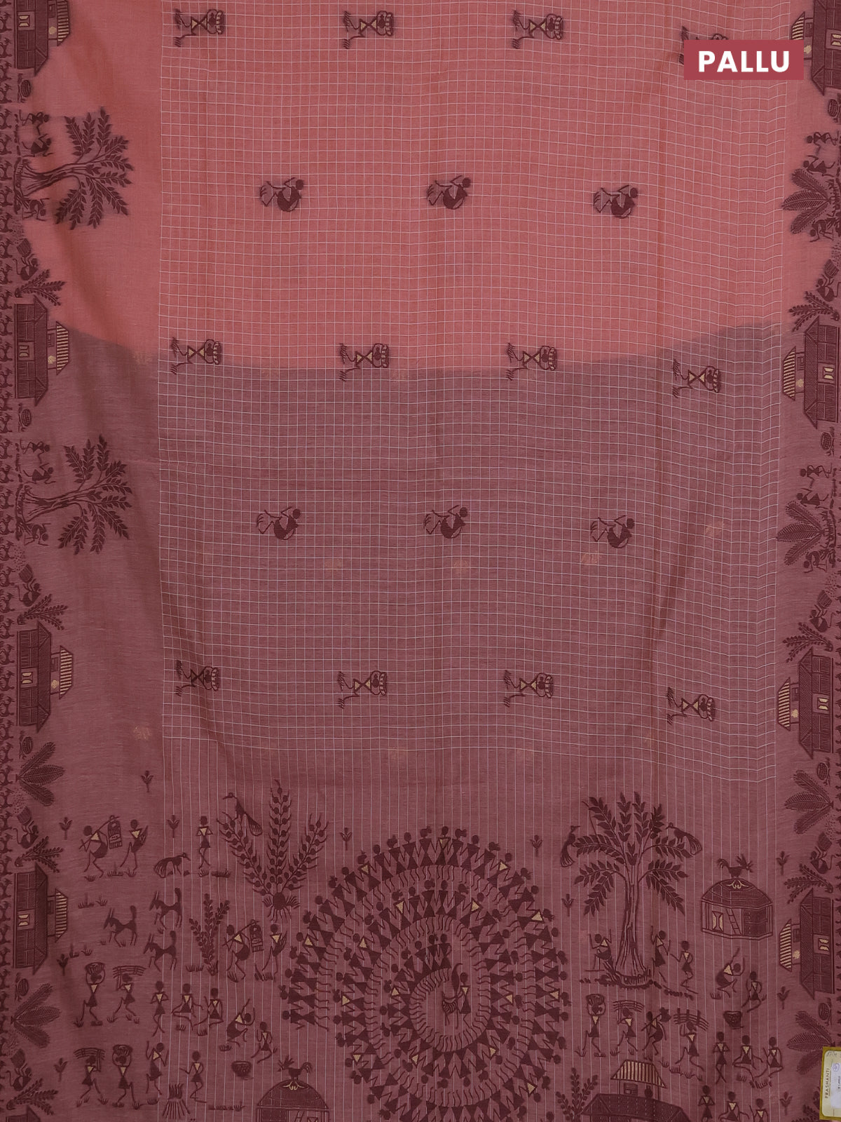 Munga cotton saree peach shade and deep maroon with allover checked pattern & thread buttas and warli design weaving pallu