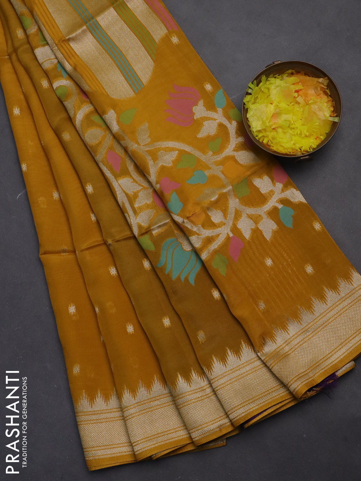 Munga crepe silk saree mustard yellow and violet with zari woven buttas and rich thread & zari woven pallu