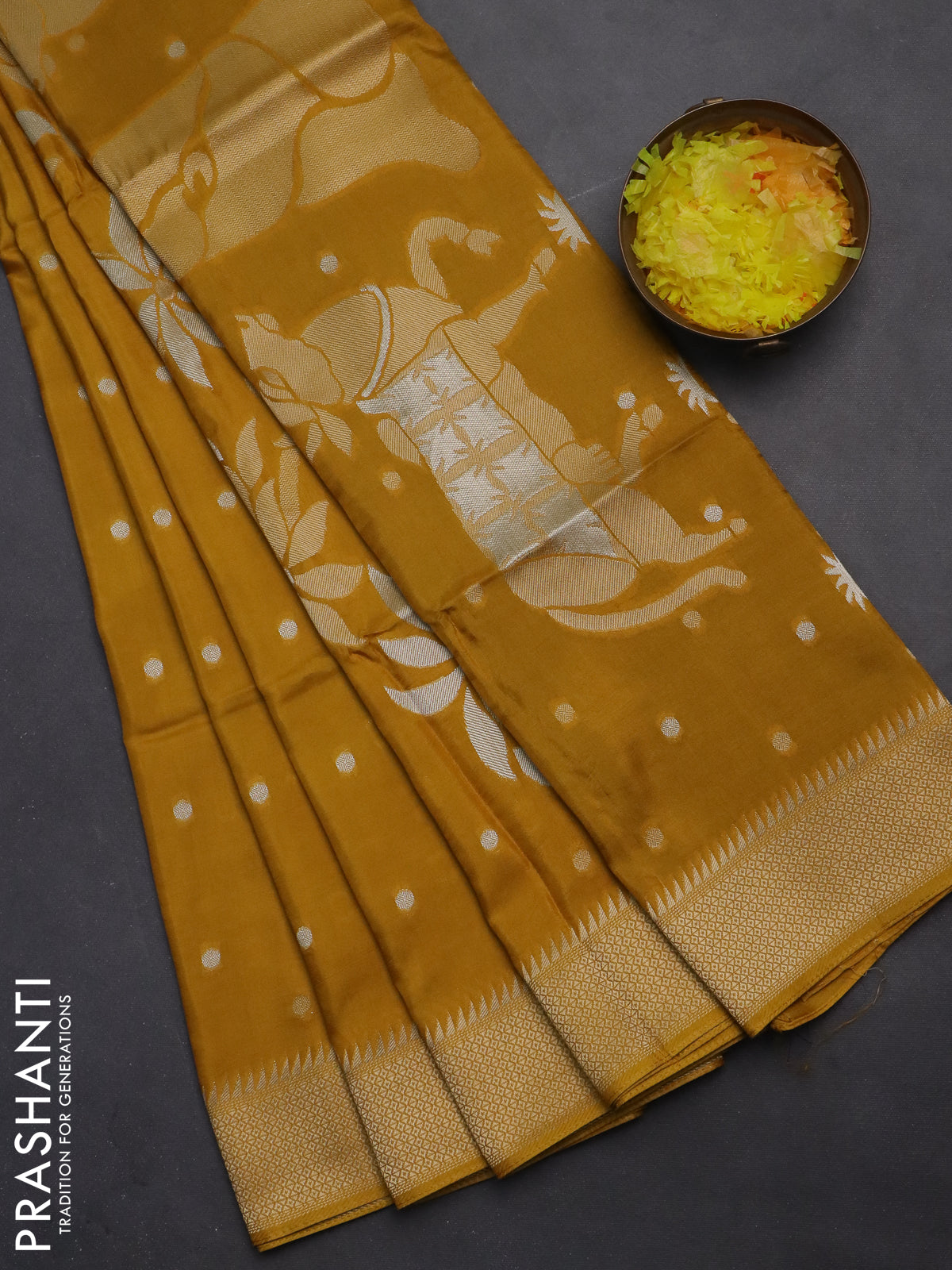 Munga crepe silk saree mustard yellow and violet with zari woven buttas and rich zari woven pallu