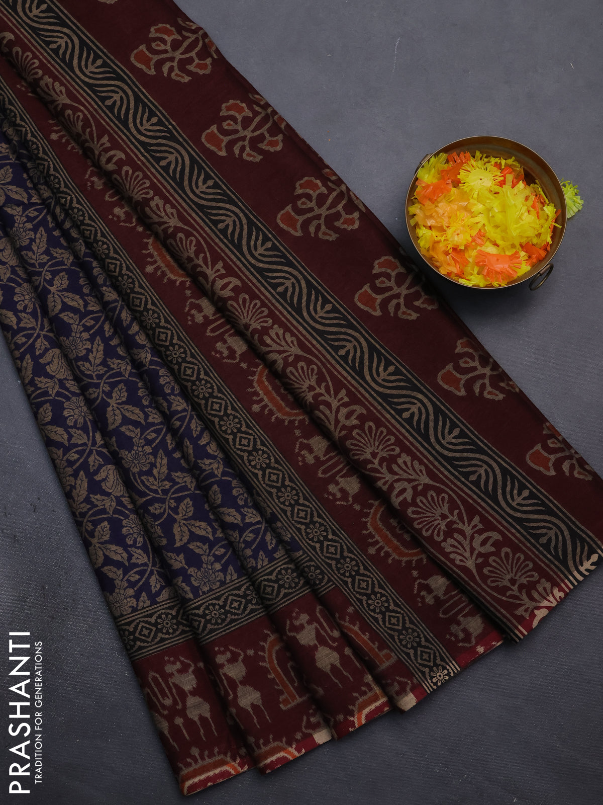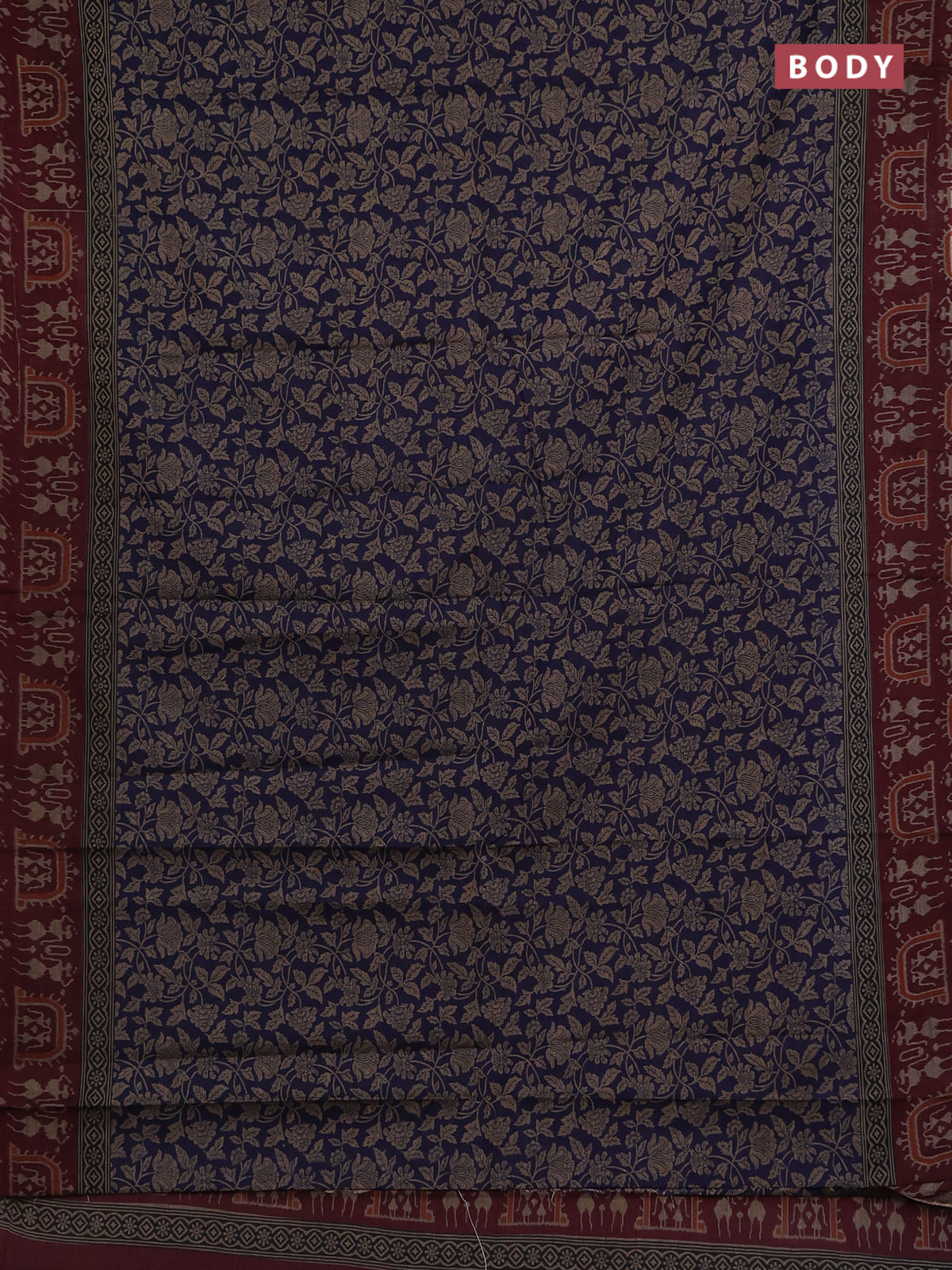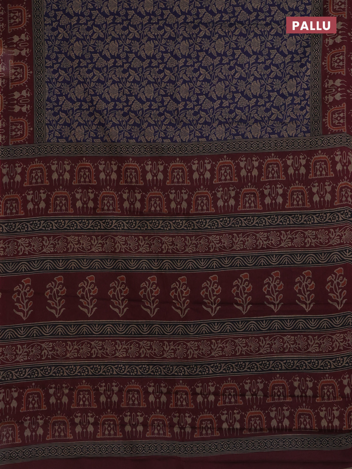 Muslin cotton saree blue and maroon with allover kalamkari prints and printed border