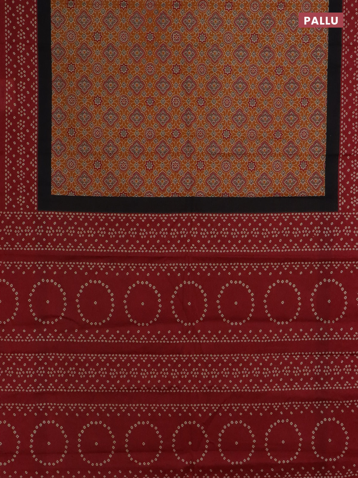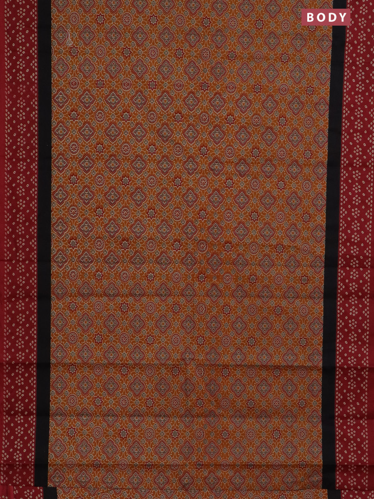 Muslin cotton saree dark mustard and maroon with ajrakh prints and printed border