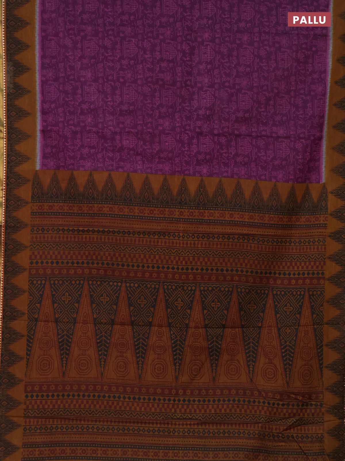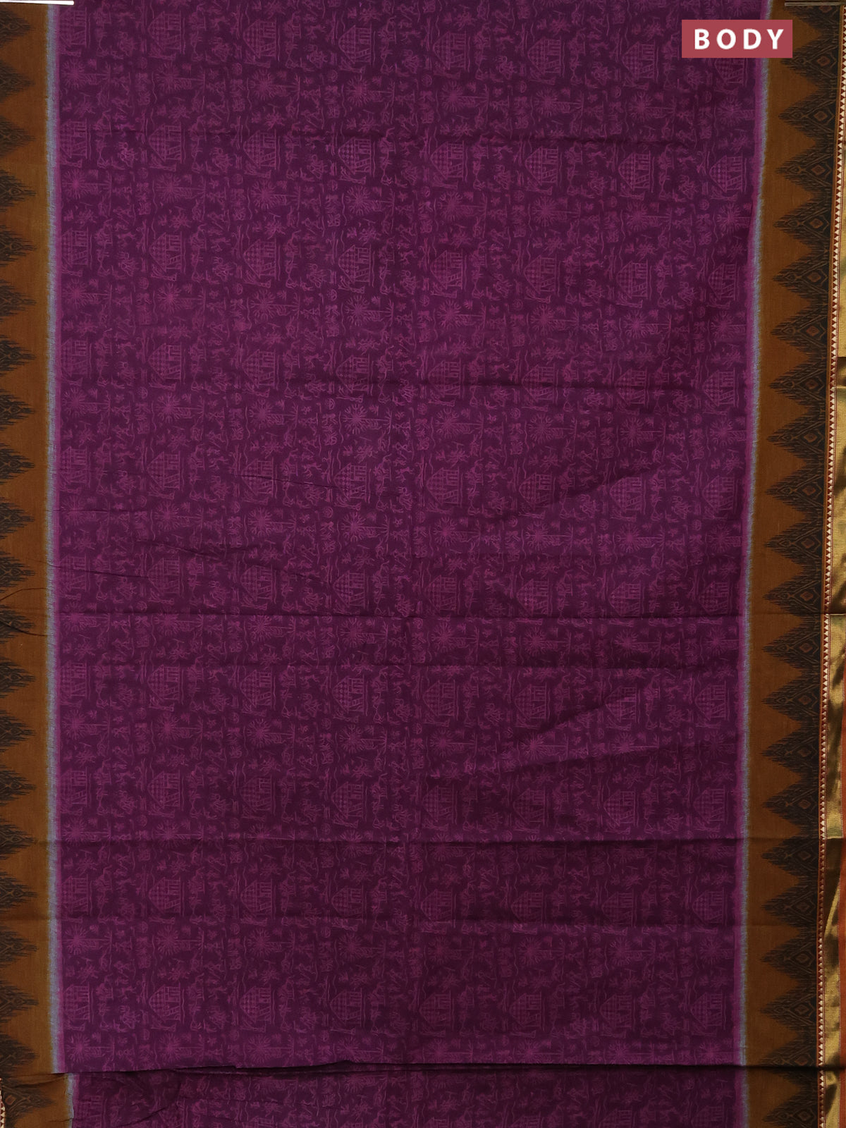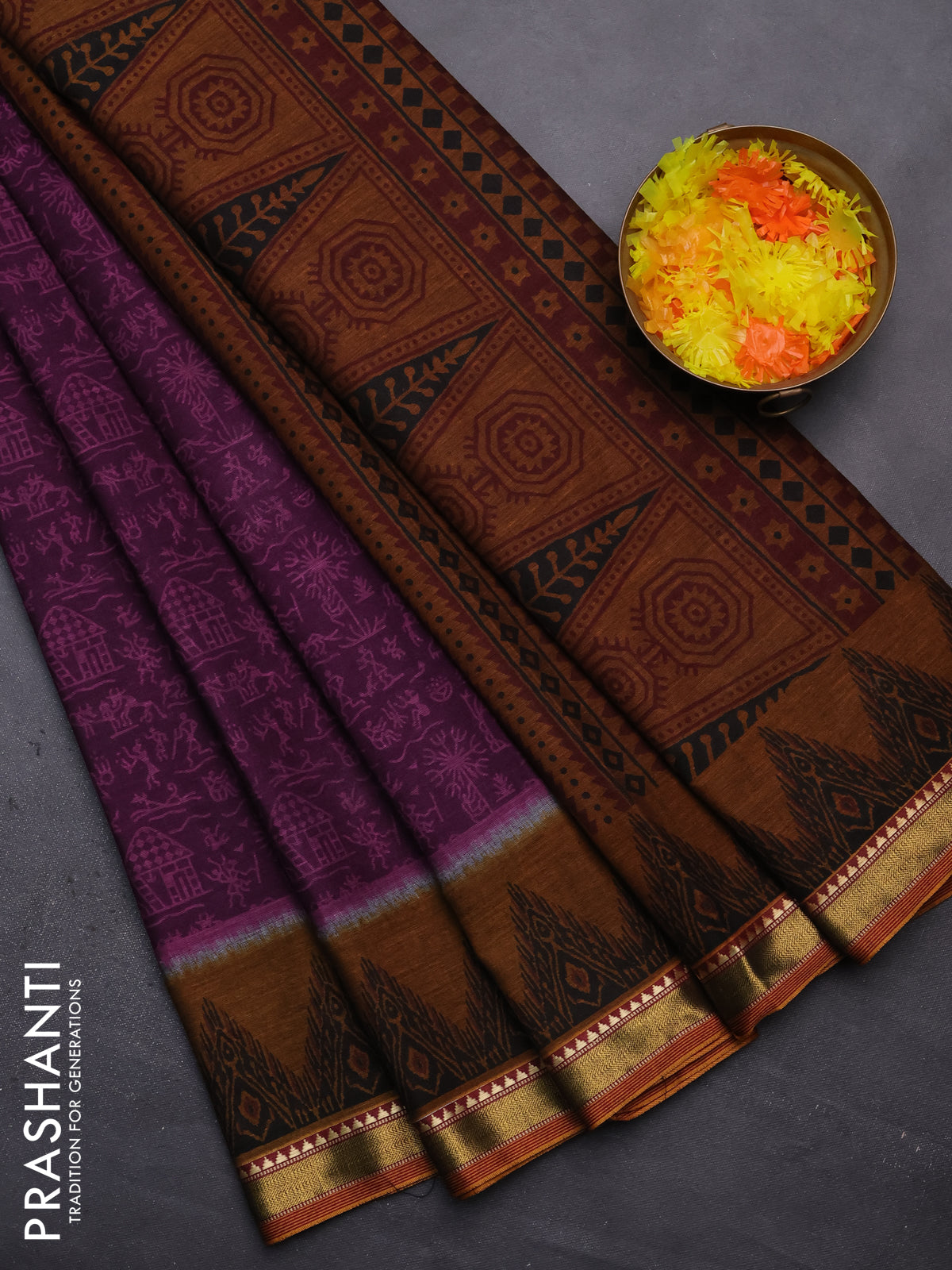 Muslin cotton saree deep purple and dark mustard with allover warli prints and zari woven border
