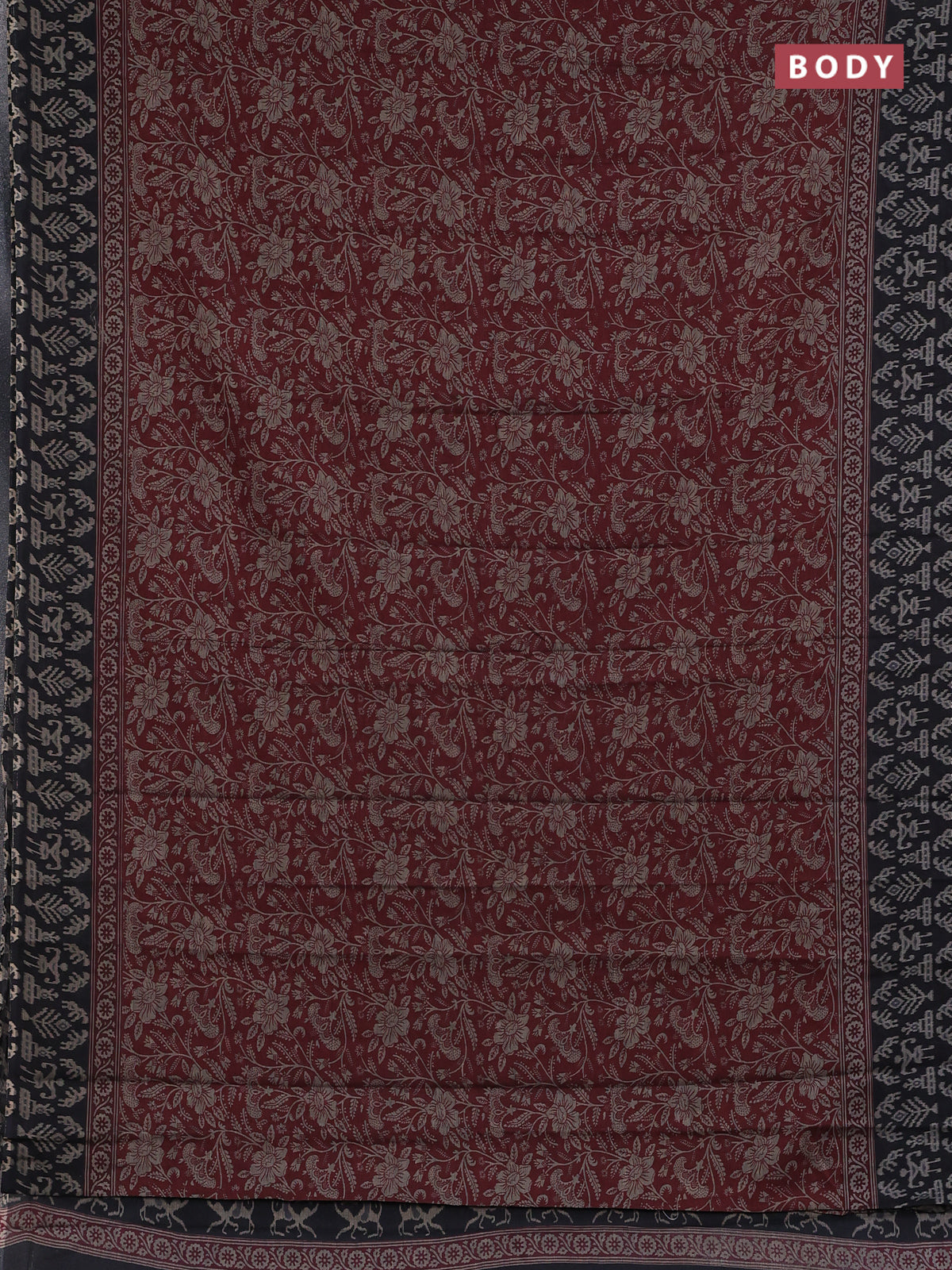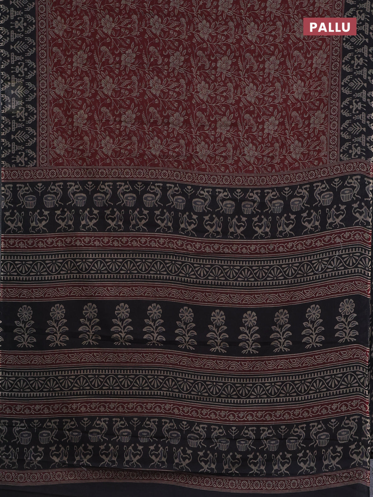 Muslin cotton saree maroon and black with allover kalamkari prints and printed border