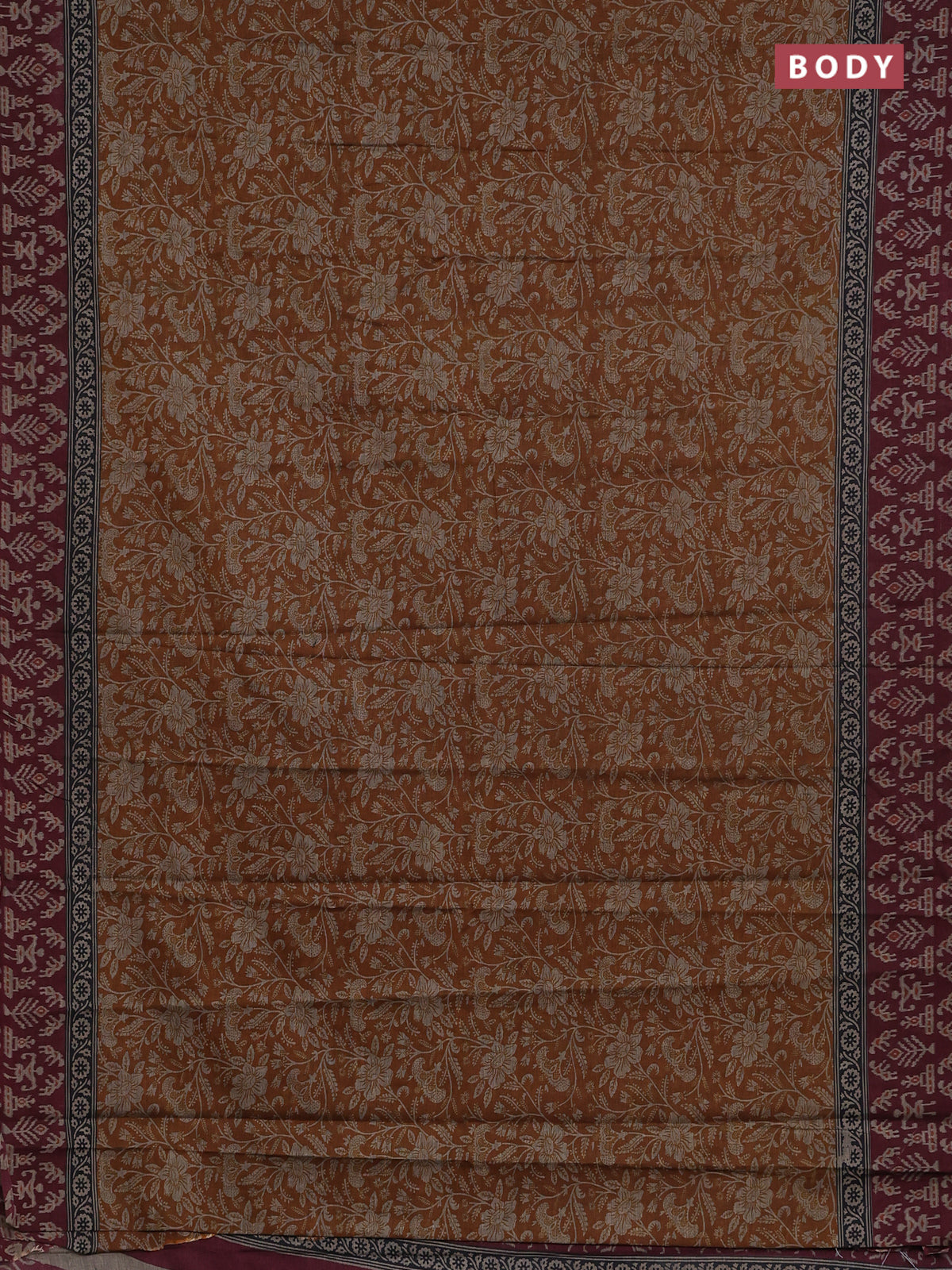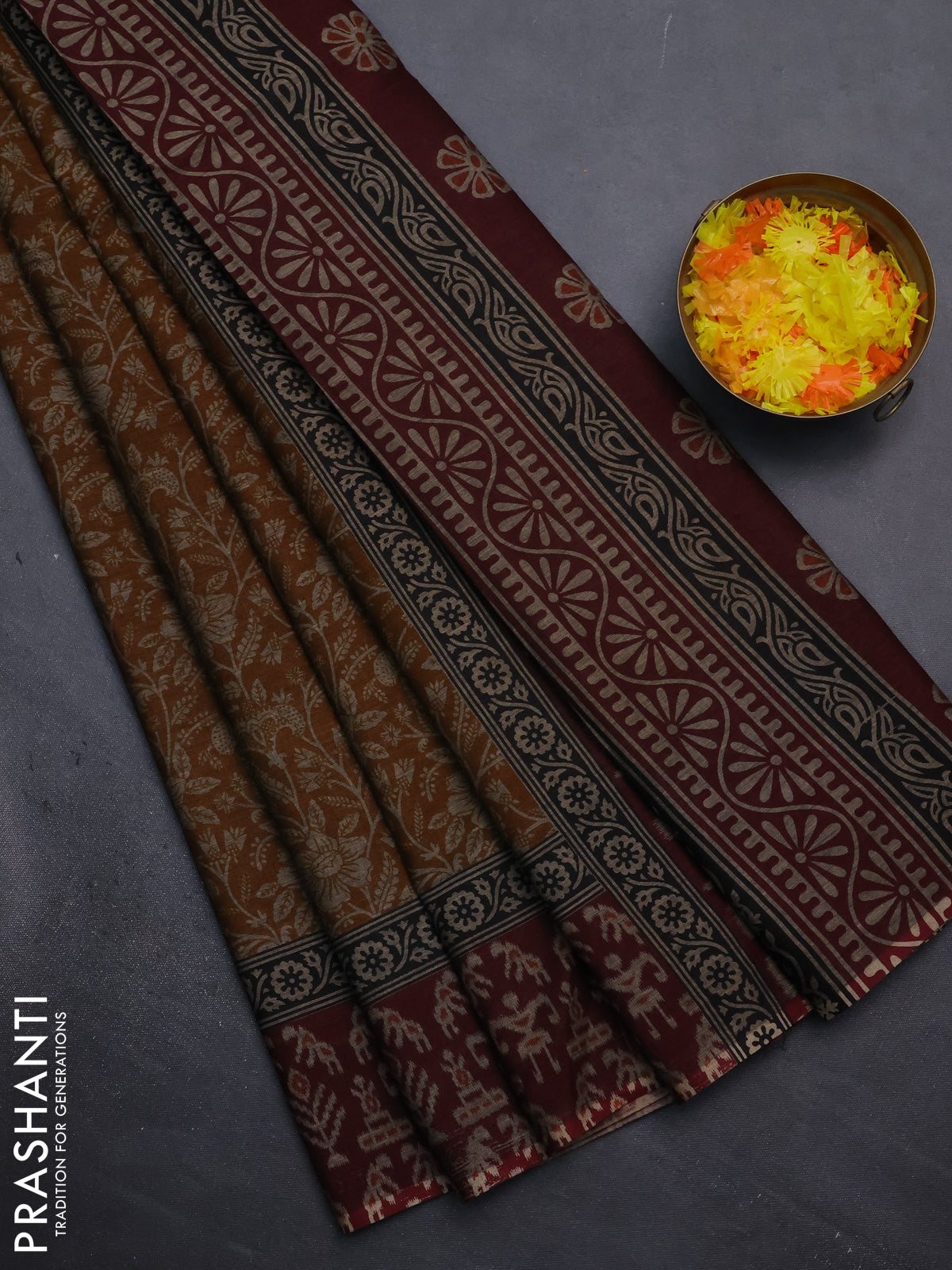 Muslin cotton saree mustad yellow and maroon with allover kalamkari prints and printed border