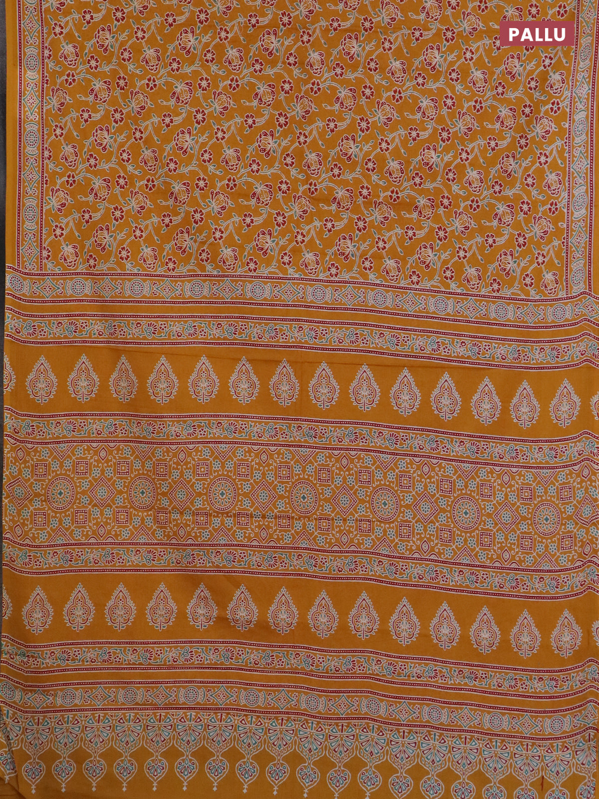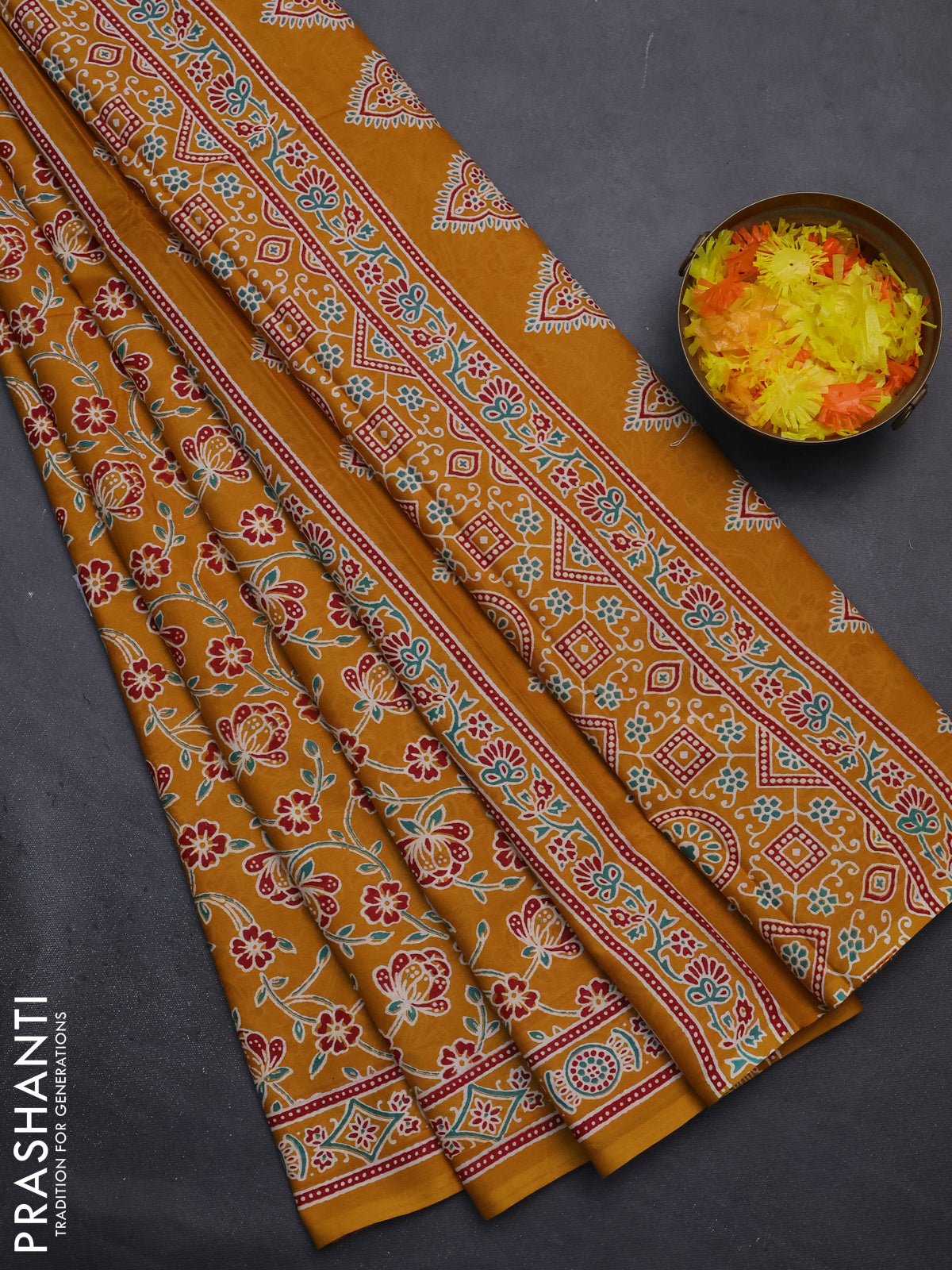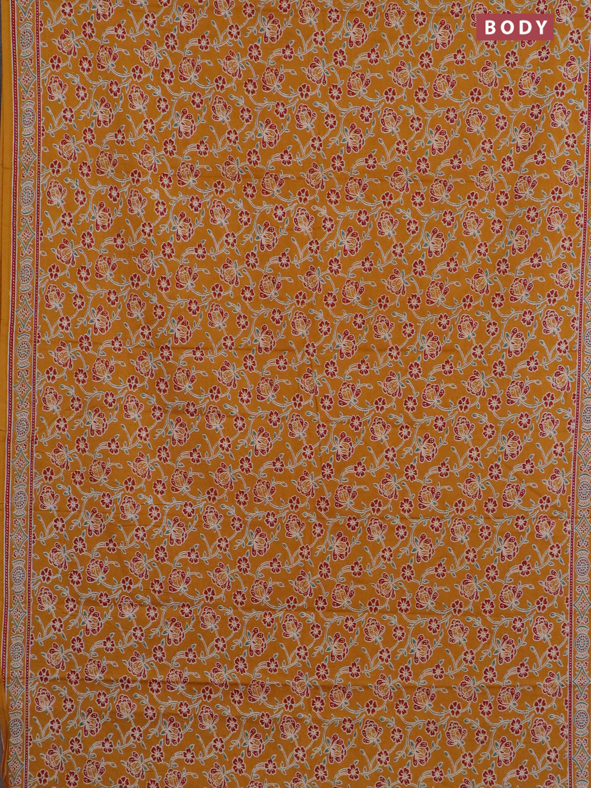 Muslin cotton saree mustard yellow with allover floral prints and printed border