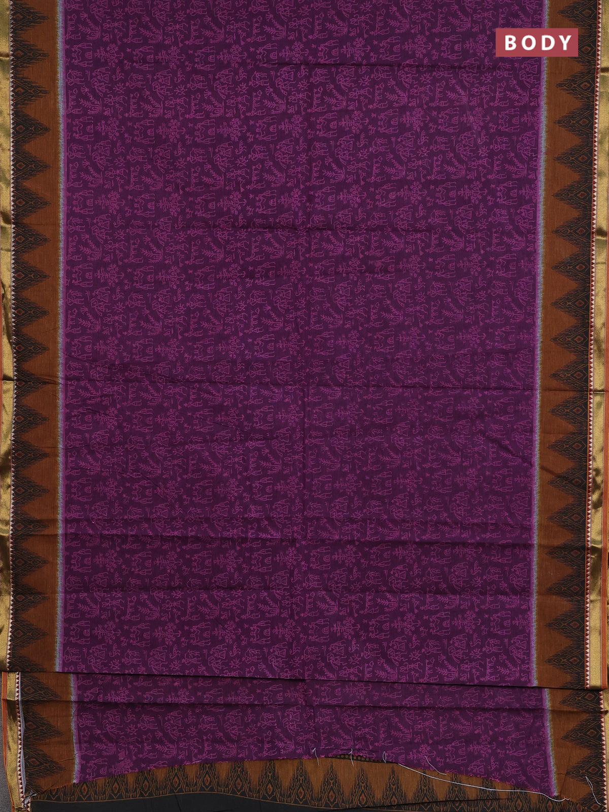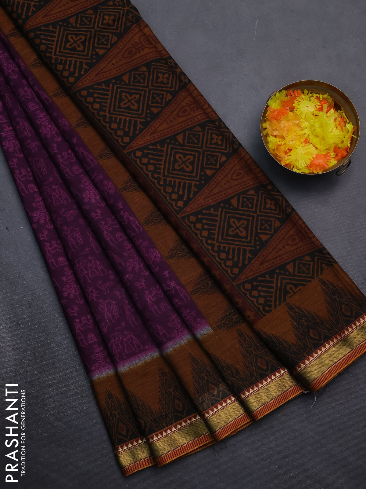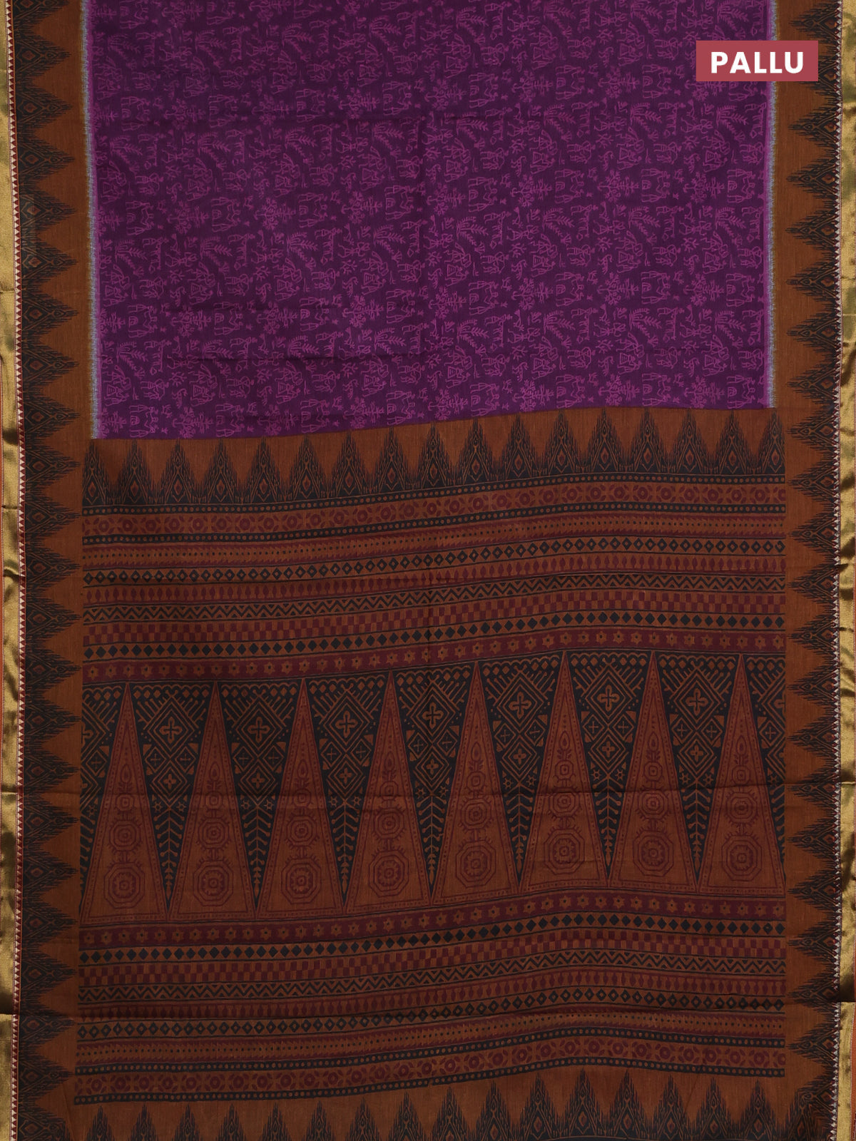 Muslin cotton saree purple and dark mustard with warli prints and woven border