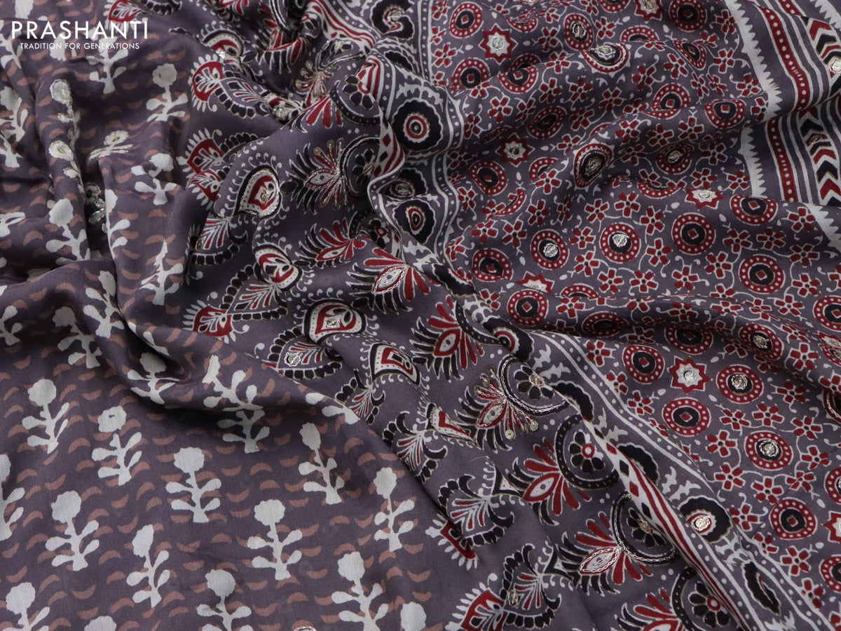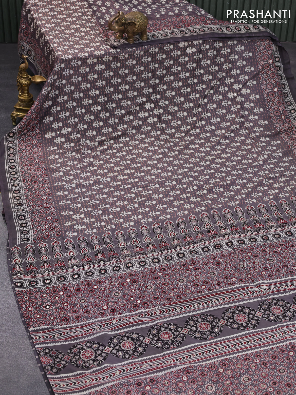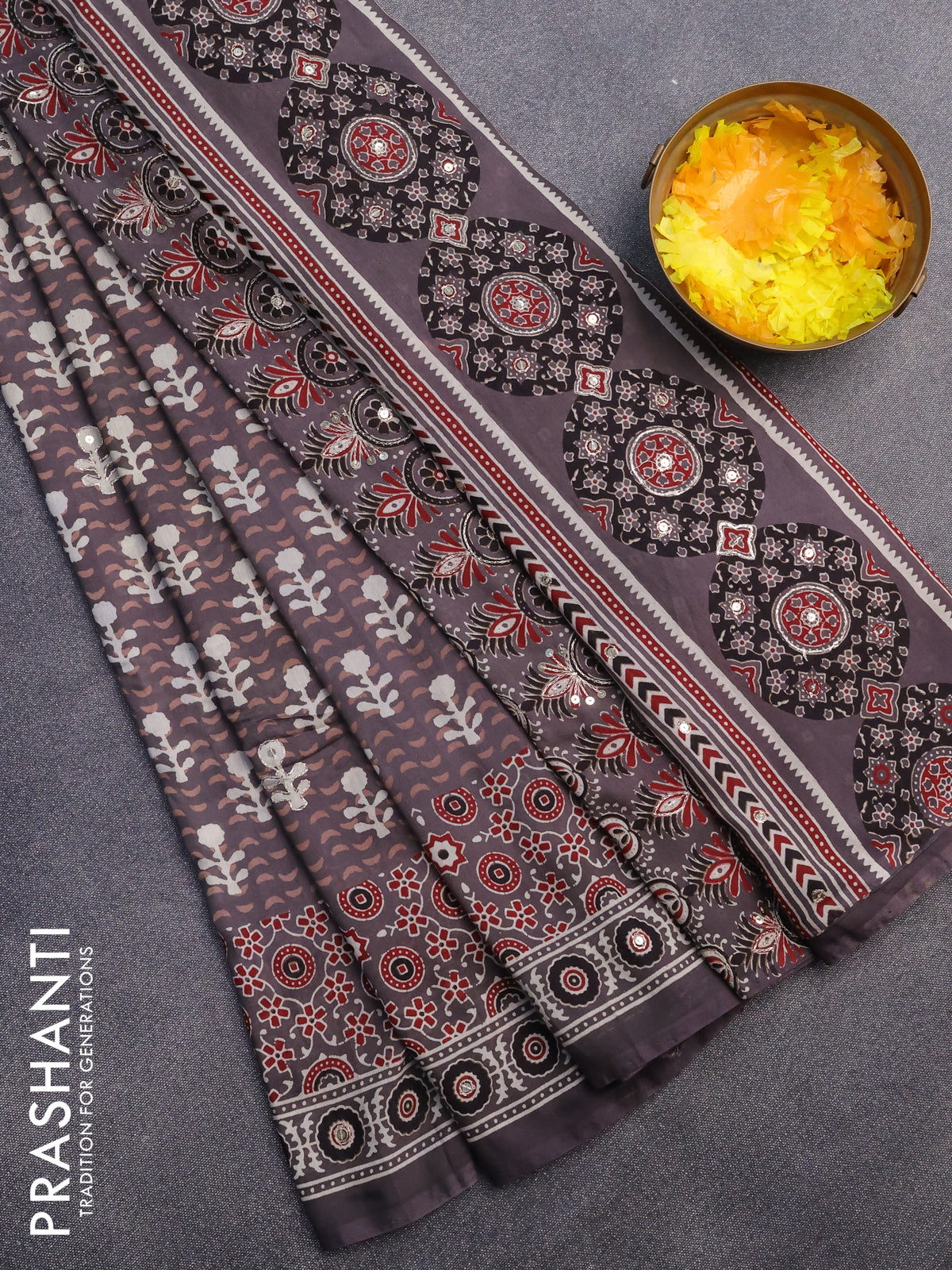 Muslin silk saree grey with allover dabu prints & pita work and ajrakh printed border