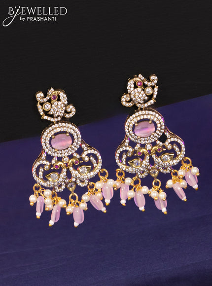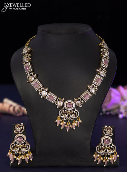 Necklace with baby pink & cz stones and beads hangings in victorian finish