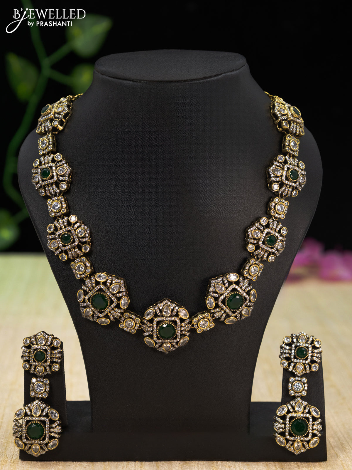 Necklace with emerald and cz stones in victorian finish