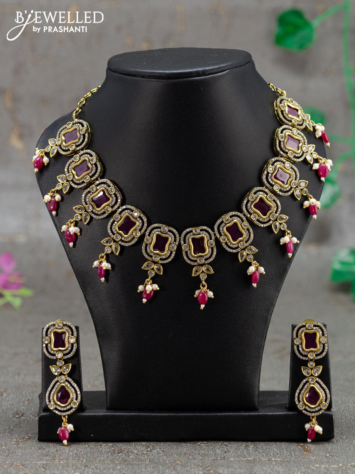Necklace with pink kemp & cz stones and beads hanging in victorian finish