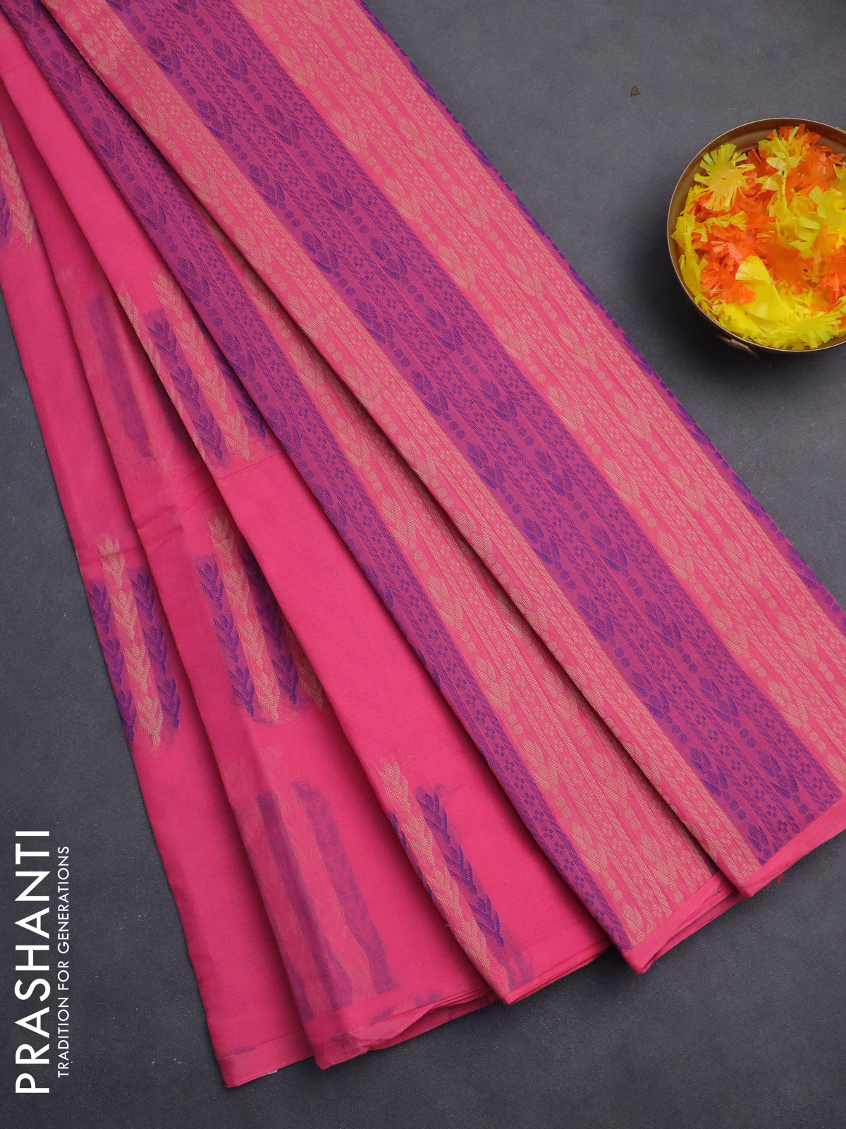 Nithyam cotton saree candy pink with thread woven buttas in borderless style