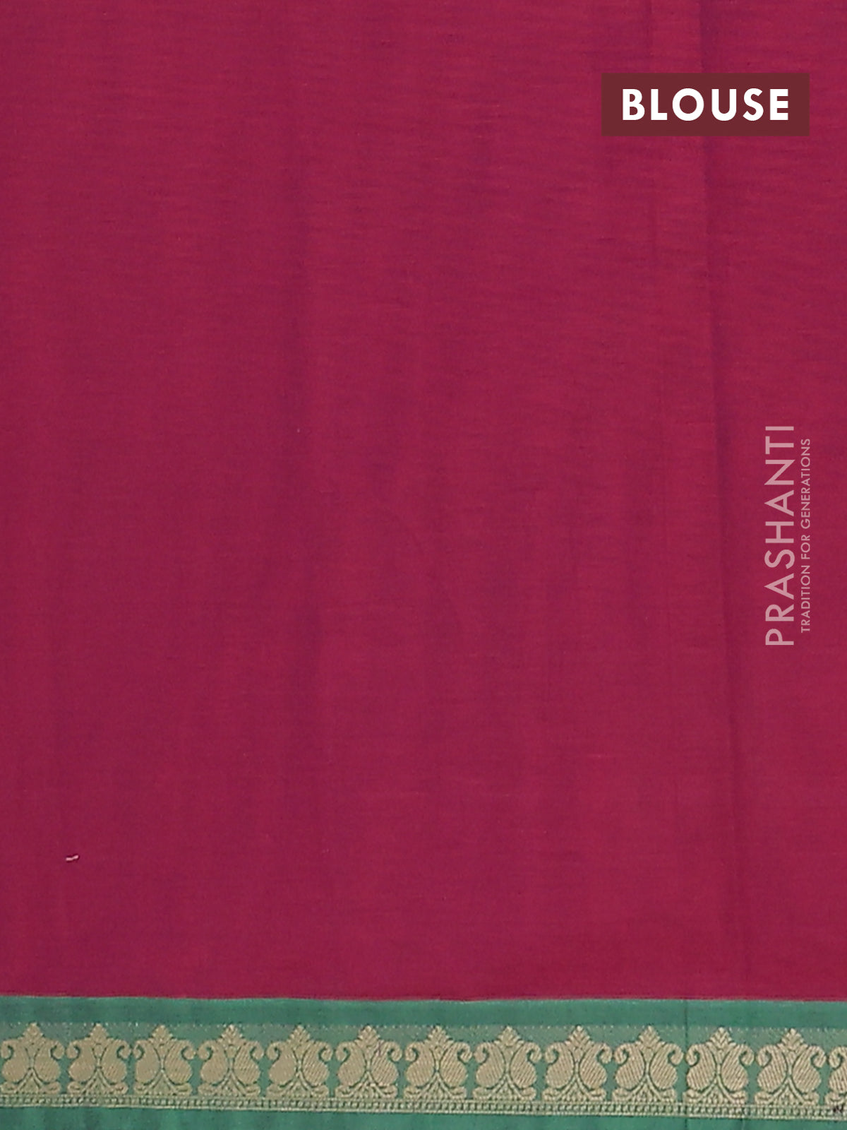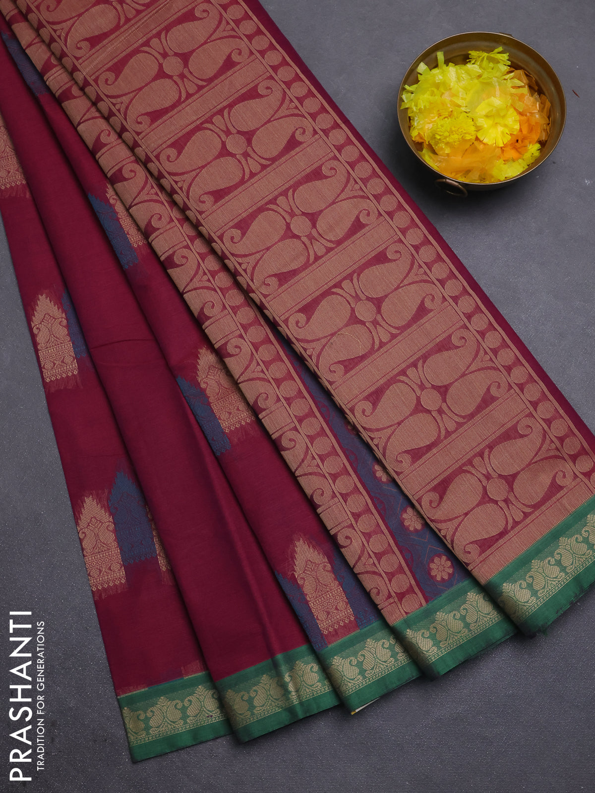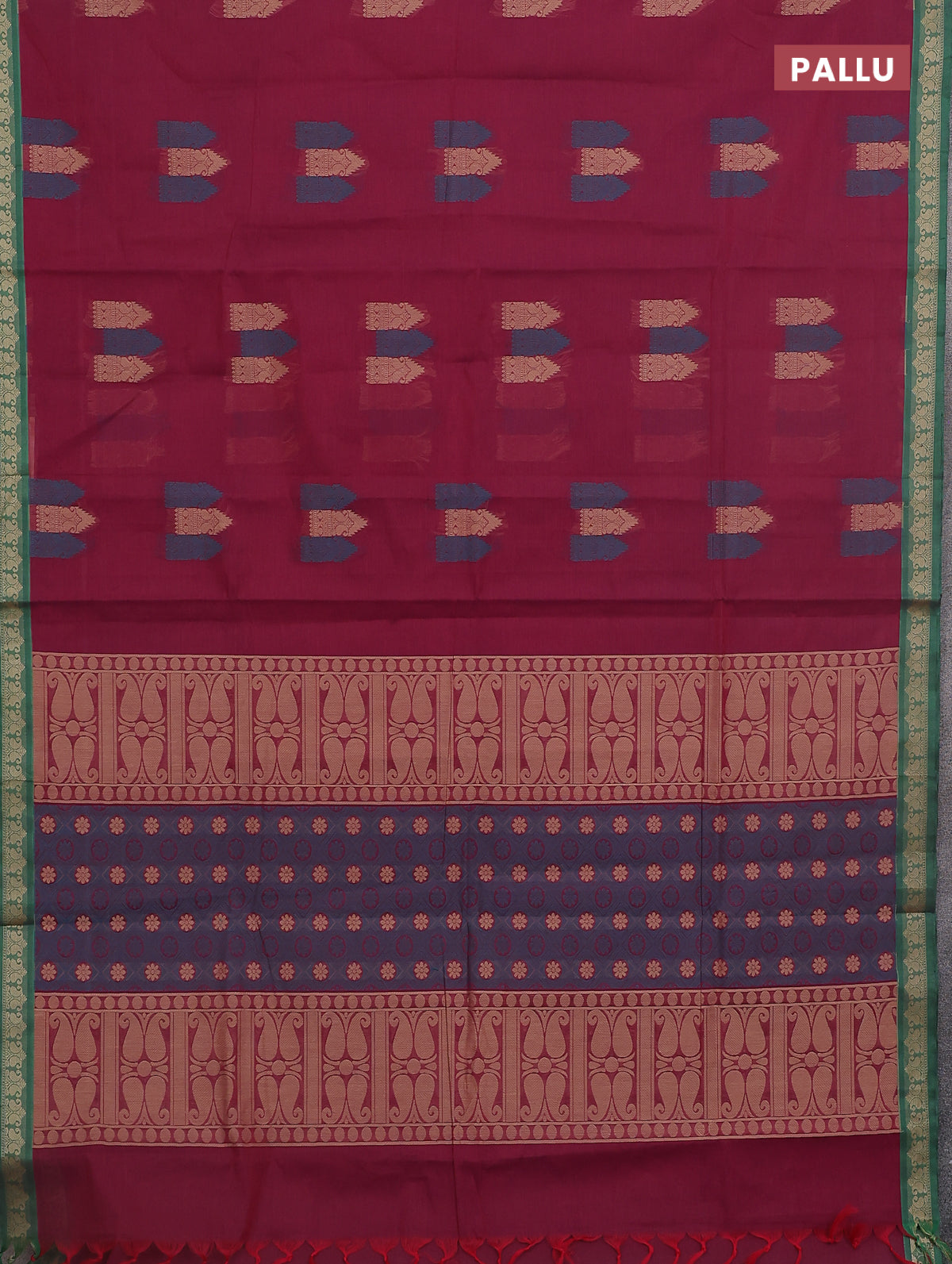 Nithyam cotton saree dark magenta pink and green with allover thread woven buttas and paisley thread woven border