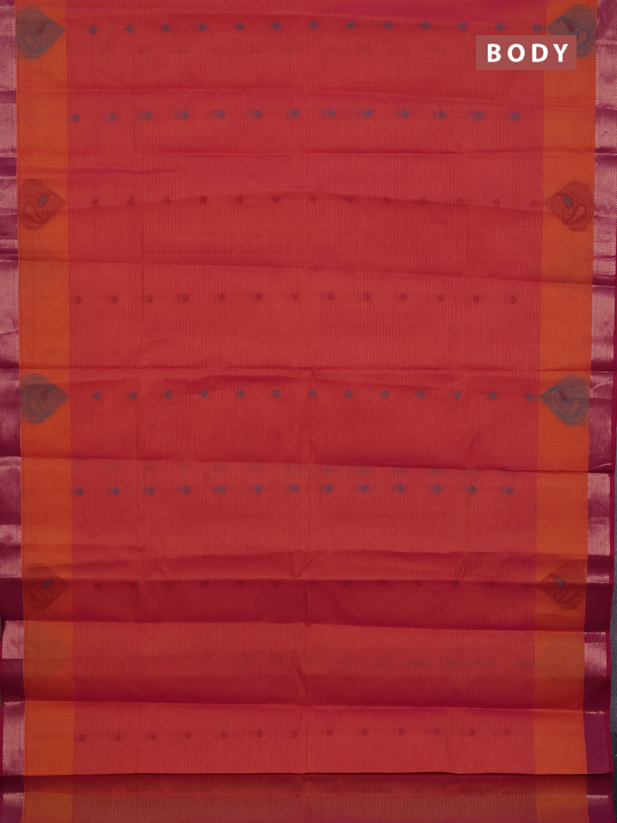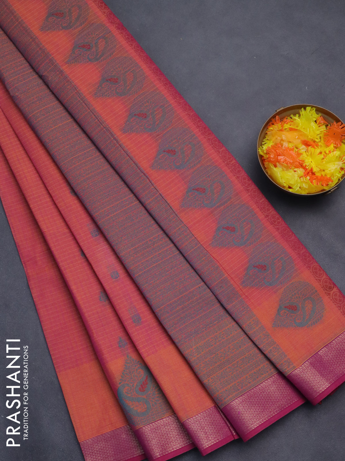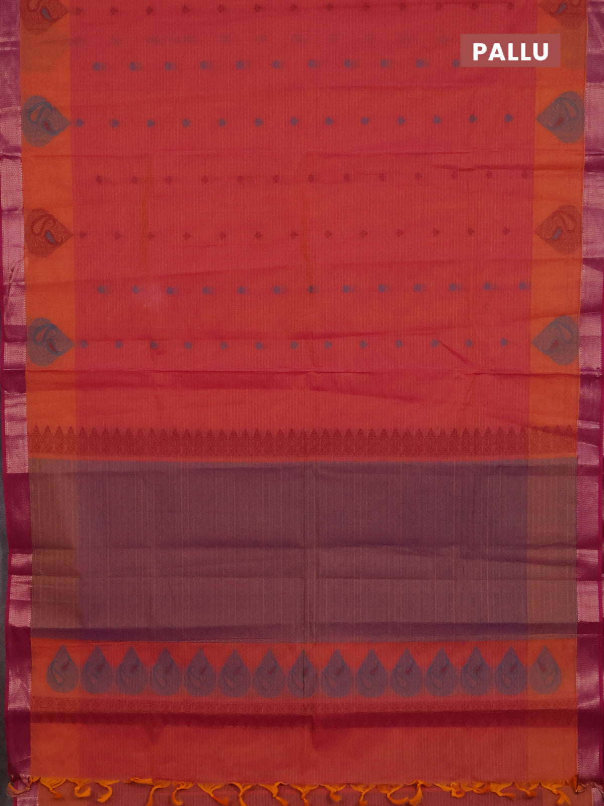 Nithyam cotton saree dual shade of pinkish orange with allover thread woven buttas and zari woven border
