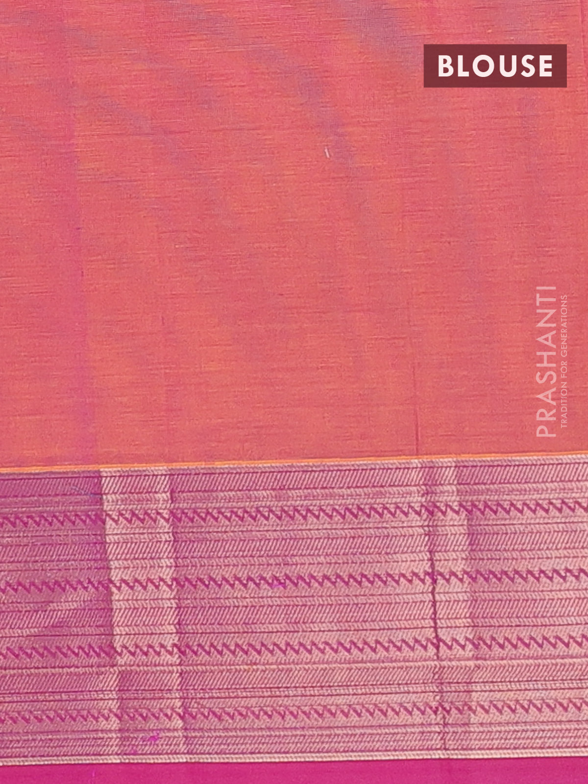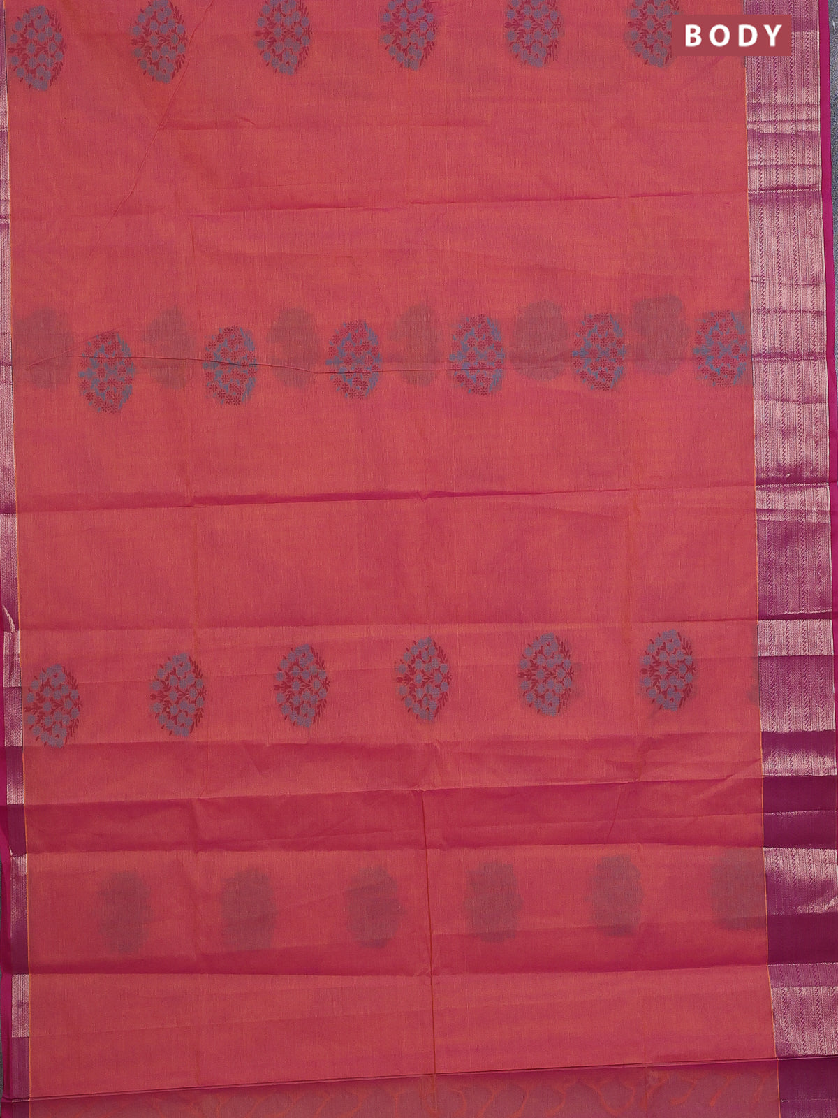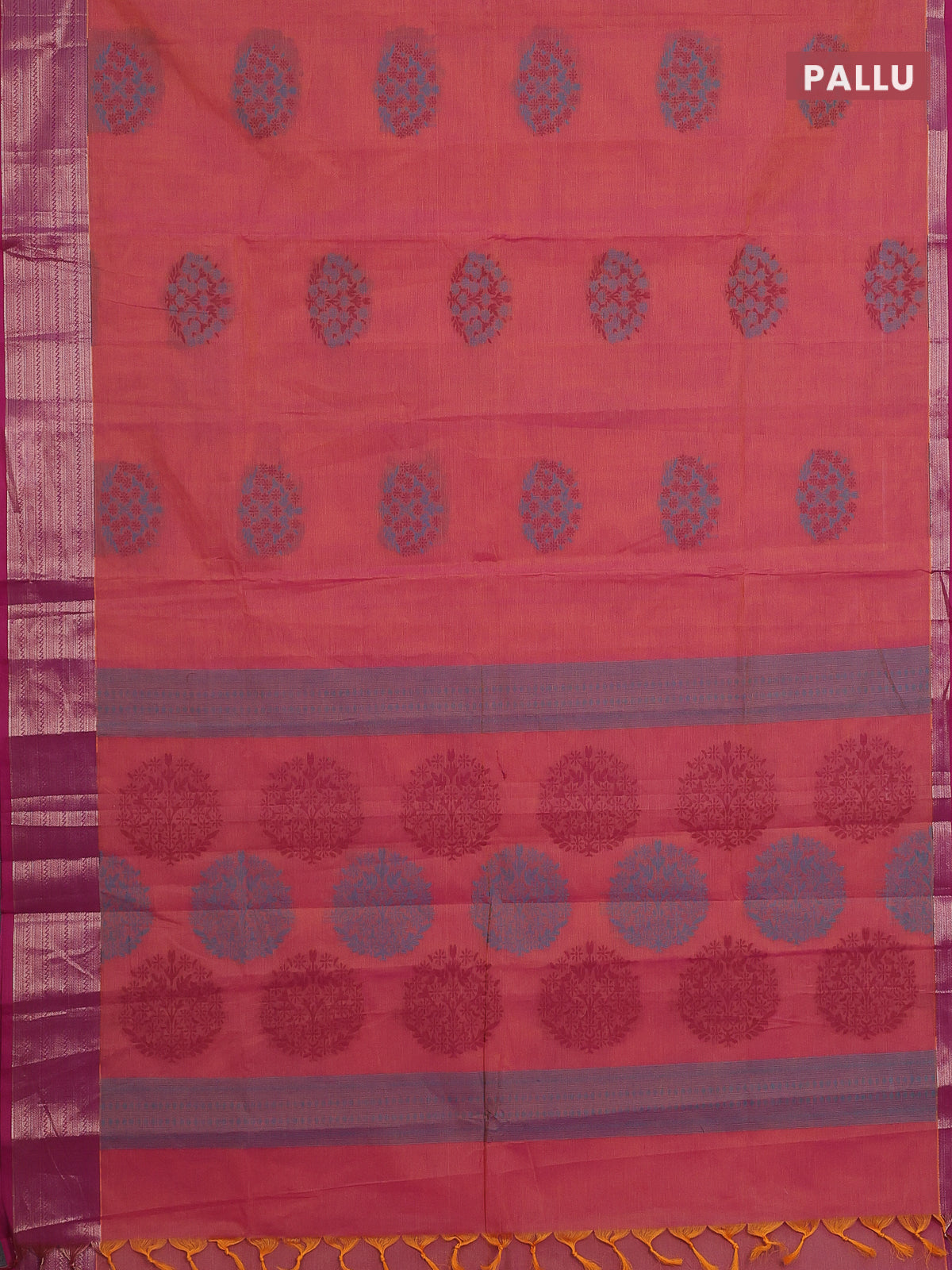 Nithyam cotton saree dual shade of pinkish yellow and magenat pink with allover self emboss & thread woven buttas and thread woven border