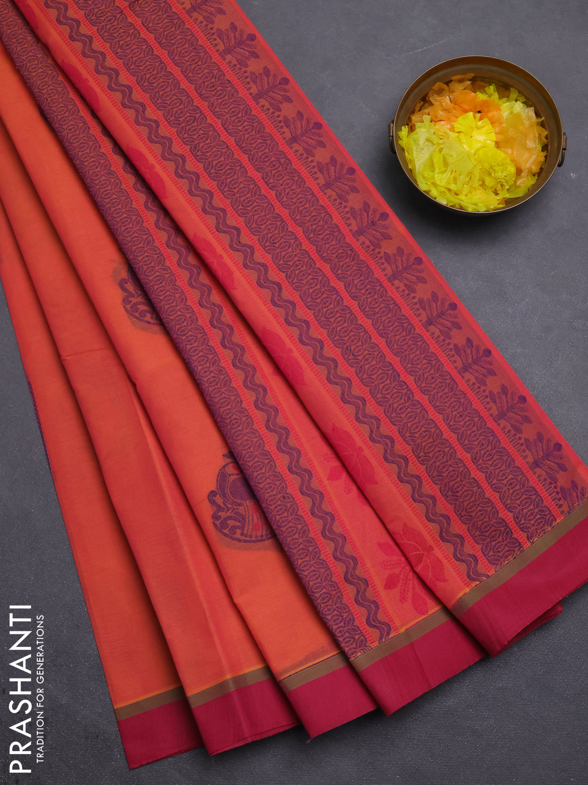 Nithyam cotton saree pinkish orange and maroon with thread woven buttas and simple border