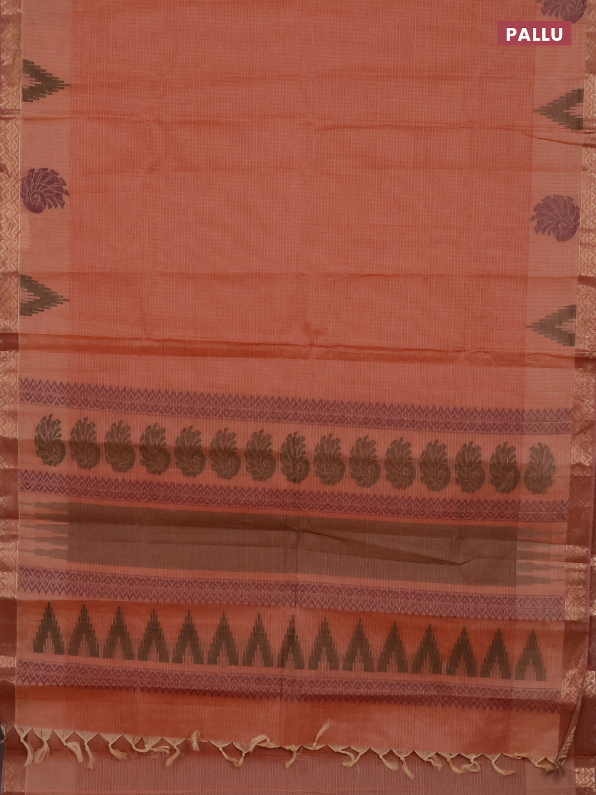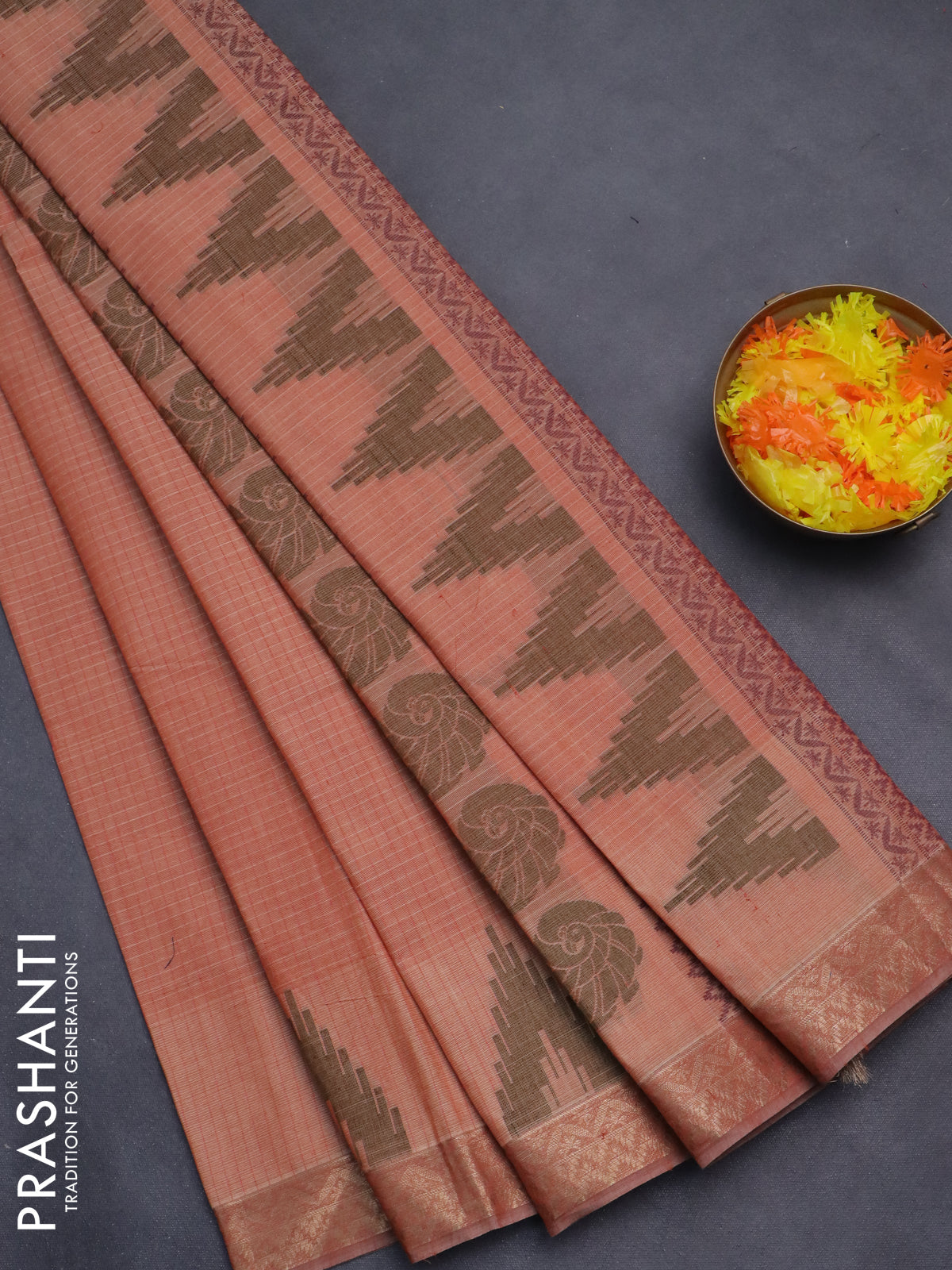 Nithyam cotton saree rust shade with allover thread stripe pattern and zari woven border