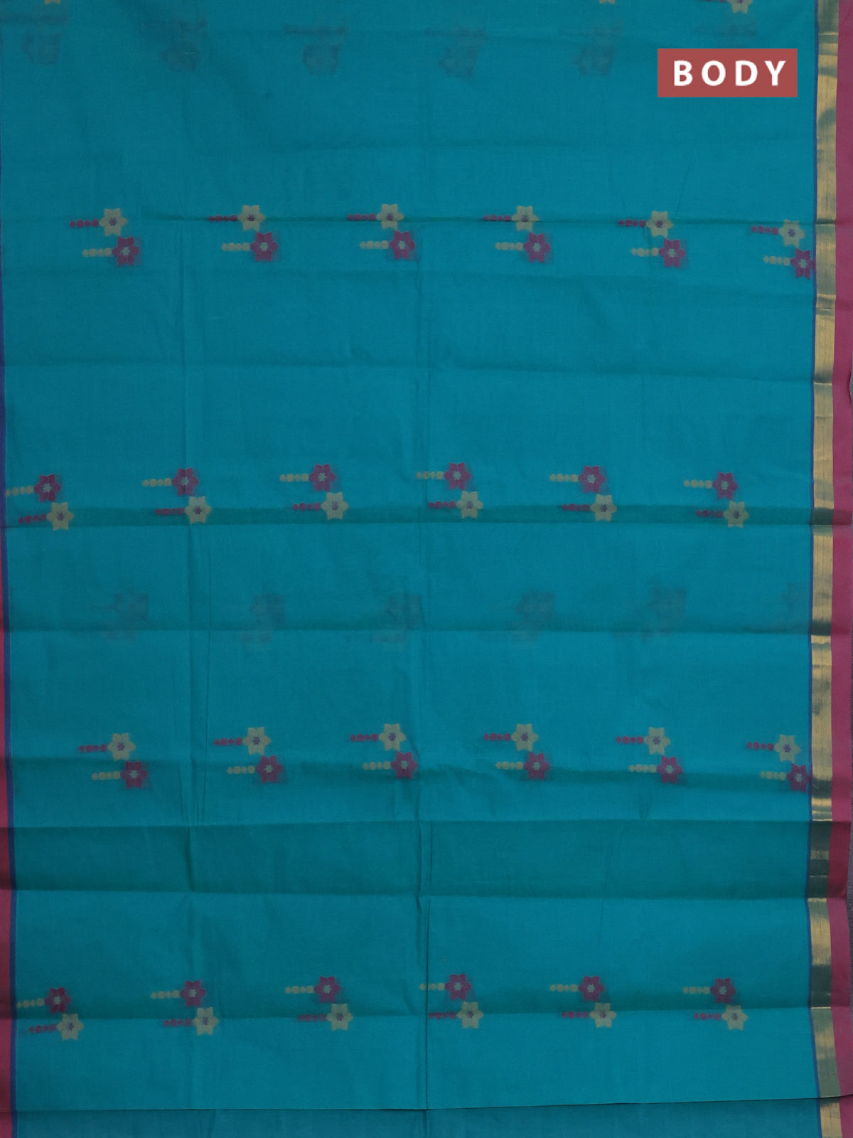 Nithyam cotton saree teal green and pink with thread woven buttas and zari woven simple border