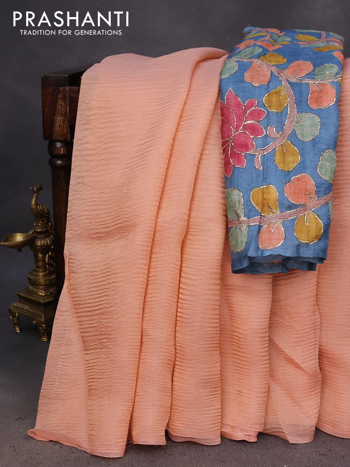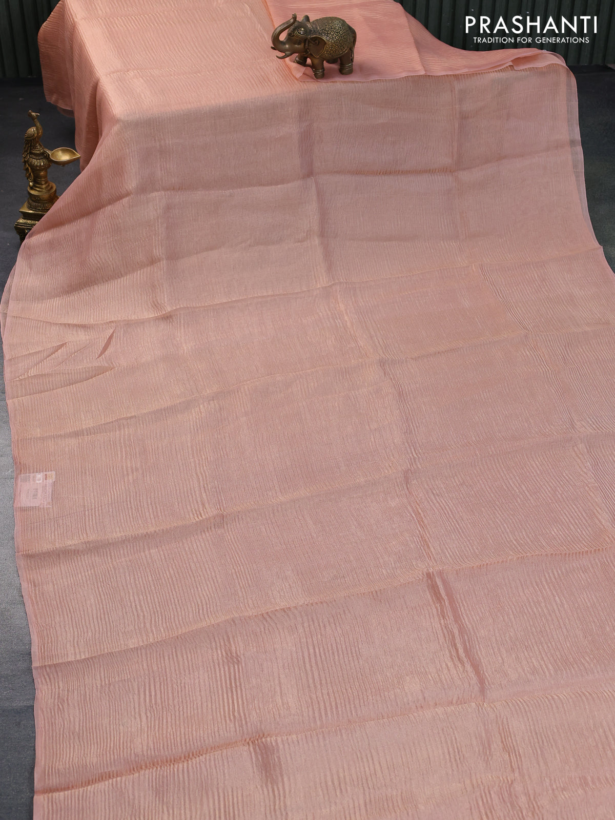Organza crushed tissue silk saree peach orange with plain body in borderless style