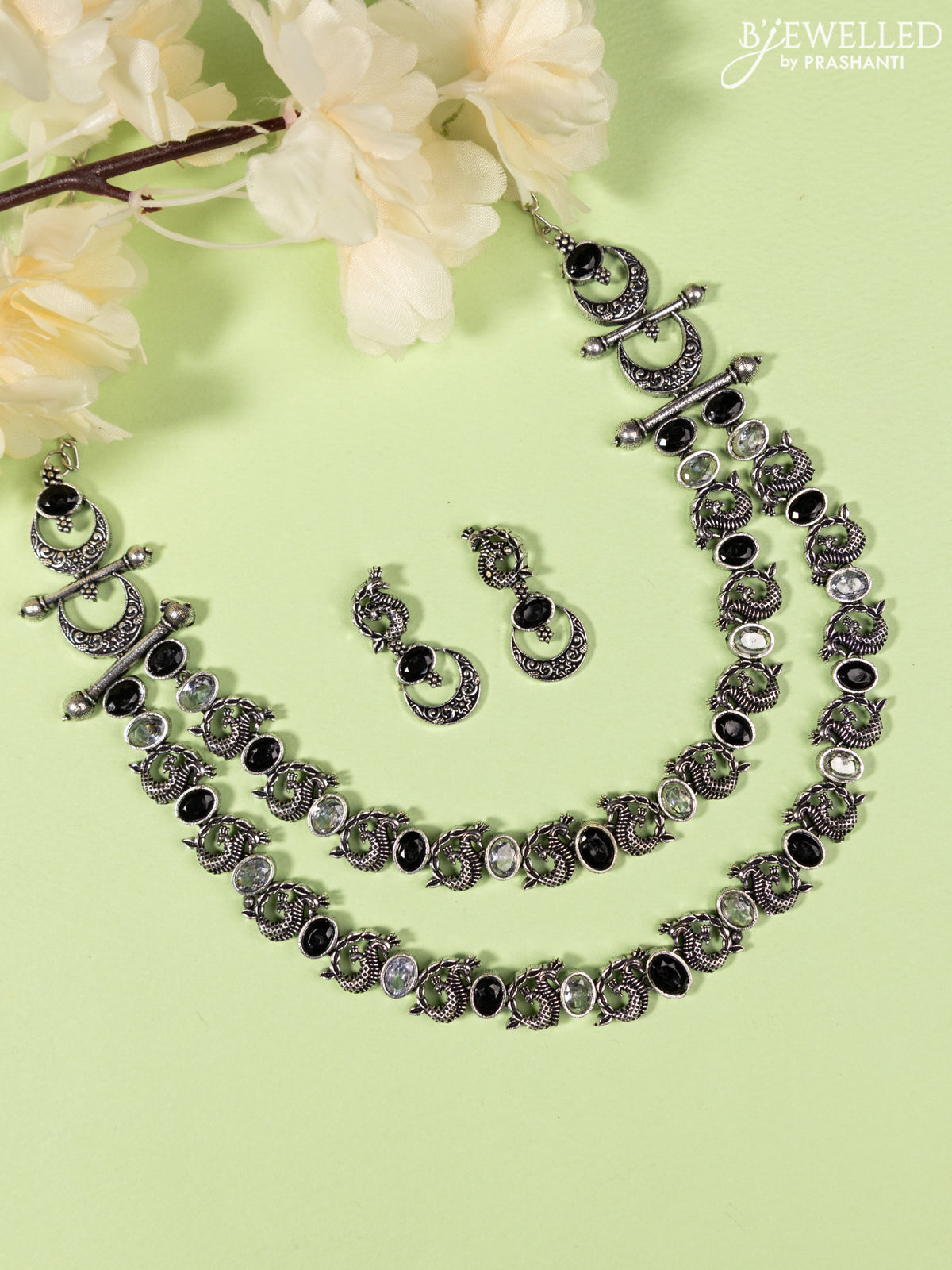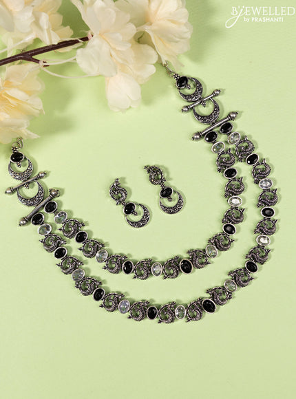 Oxidised double layer Necklace peacock design with black and cz stones